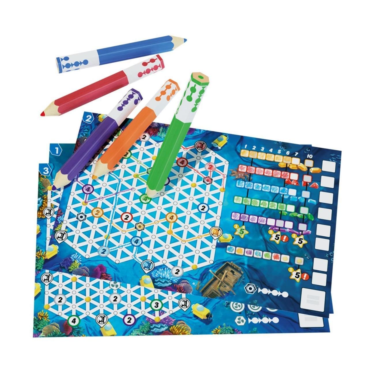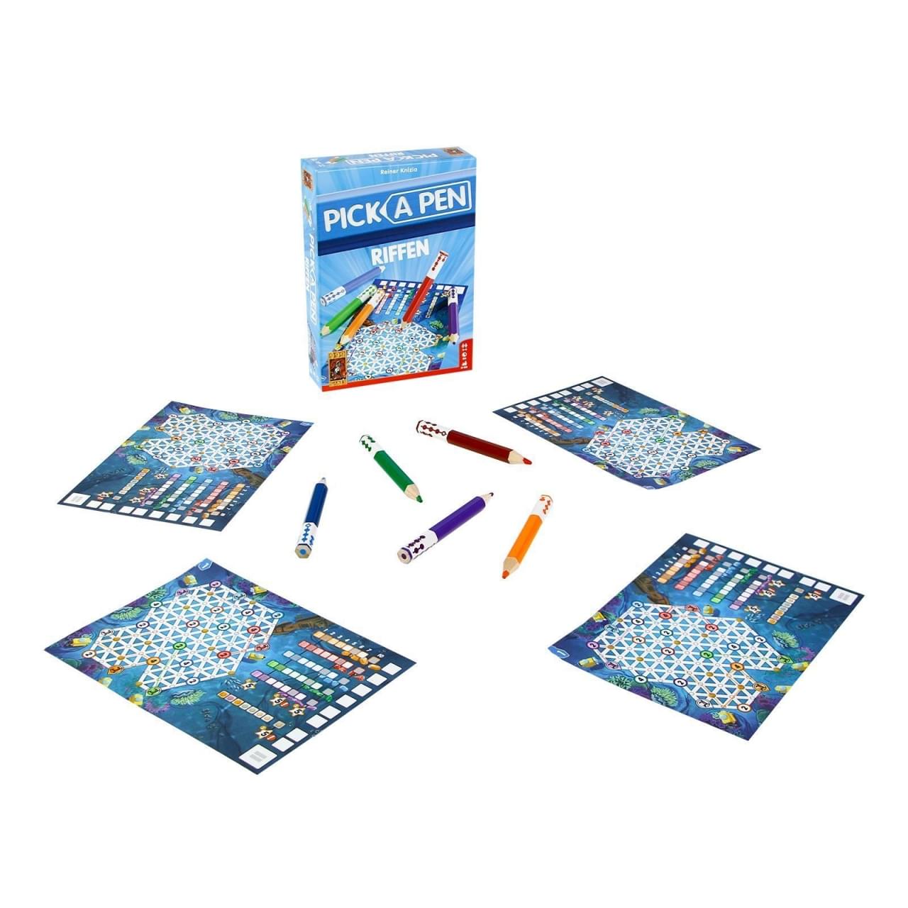 Het doel van Pick a Pen Riffen is om rondom een gezonken schip de oceaan te verkennen. Om schatten te bereiken vorm je routes van dezelfde kleur, pas daarbij op voor draaikolken. In dit Roll & Write spel van 999 Games wordt er met de potloden gerold, het aantal op het potlood bepaalt hoeveel velden je op je scoreveld mag inkleuren.
