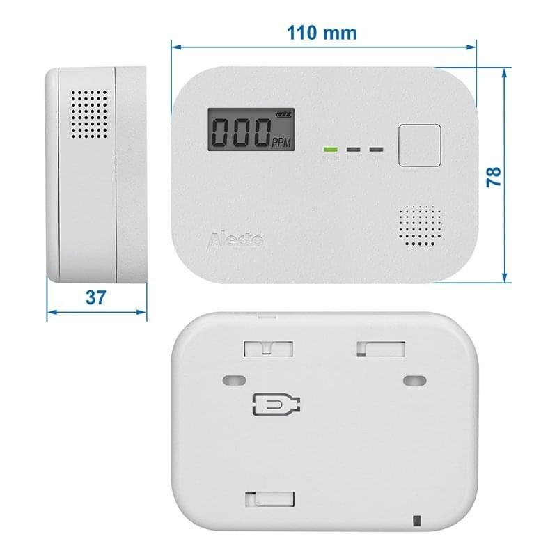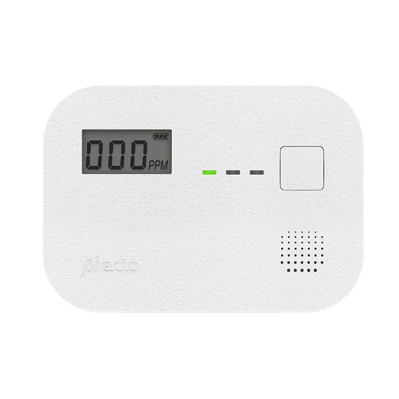 Deze koolmonoxide melder meet de koolmonoxide concentratie en waarschuwt wanneer deze gevaarlijk hoog wordt. De melder van Alecto werkt op 3 AA batterijen en geeft bij alarm een luid alarmsignaal van 85dB. Het display is duidelijk en heeft onder meer een led indicatie voor een alarm, storing of normale werking. Ook zijn er een testknop en een resetknop aanwezig.