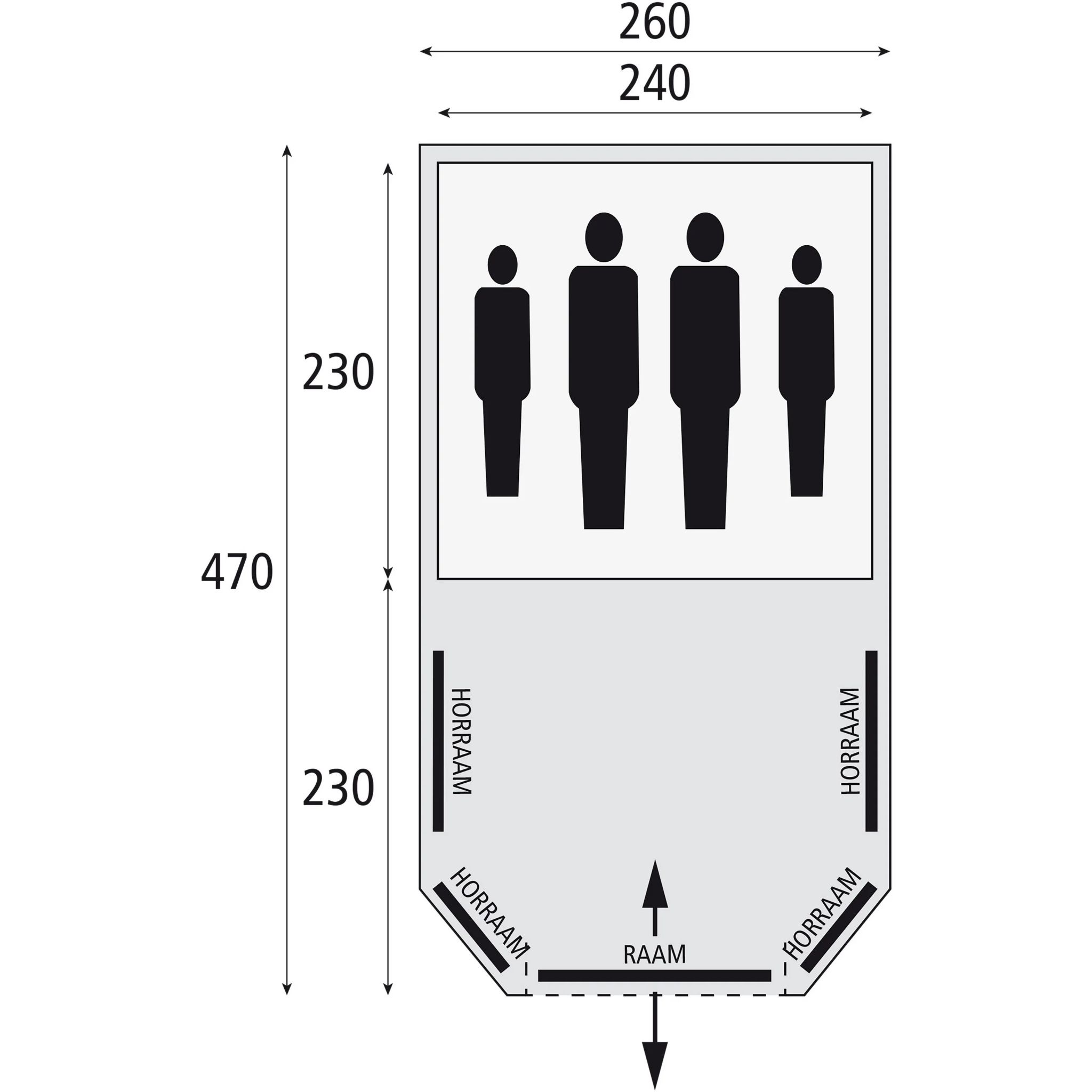 De 4-persoons tent biedt een fijne leefruimte én een extra lange, verduisterde slaapcabine van 230 cm diep. Dat betekent: voldoende ruimte om binnen te zitten tijdens een regenbui én comfortabel slapen zonder je voeten tegen het doek.
