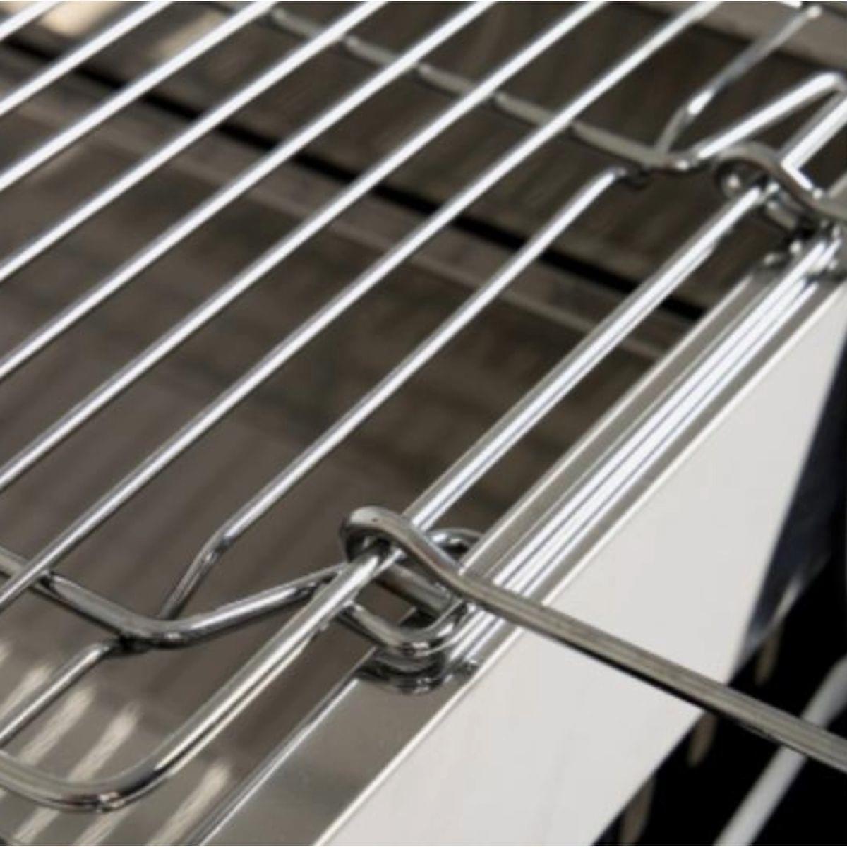 Het barbecuegedeelte is vervaardigd uit roestvrij staal, waardoor het duurzaam en gemakkelijk te reinigen is. Daarnaast kun je het rooster eenvoudig omhoog plaatsen om de warmte beter te reguleren. De ventilatiegaten aan de zijkanten zorgen voor een optimale luchtcirculatie, zodat je gerechten perfect garen.