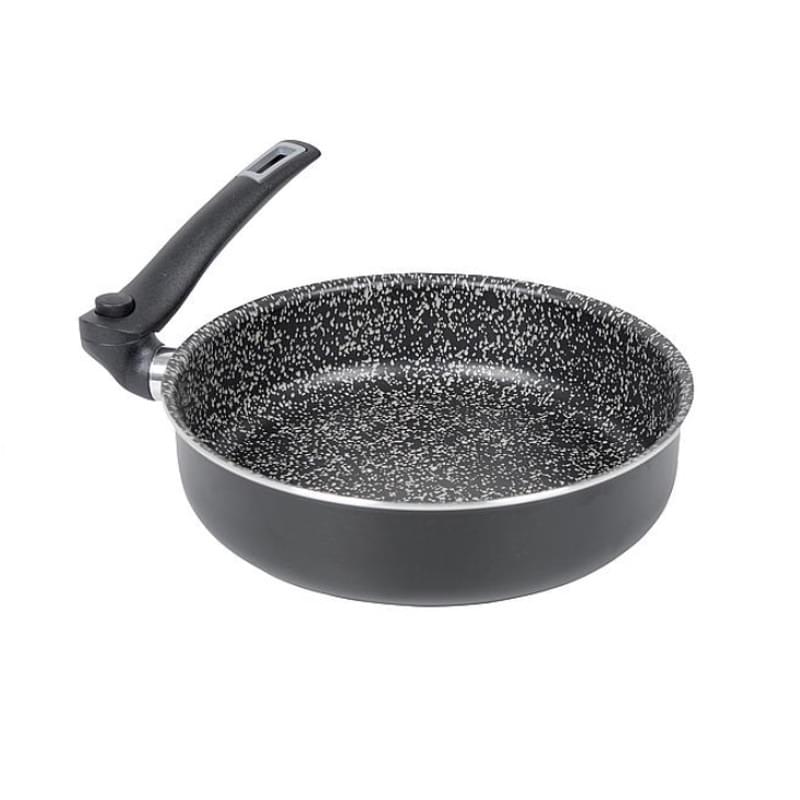 De Turn hapjespan van Bo-Camp heeft een handvat wat weggedraaid kan worden. Hierdoor kan de pan compact opgeborgen worden zonder dat je een los handvat hebt wat zoek kan raken. De pan is gemaakt van aluminium en is voorzien van een stevige 5-laagse Salus stenen anti-aanbak coating. De hapjespan is geschikt voor het koken op gas of elektrisch en kan ook voor keramisch koken gebruikt worden.