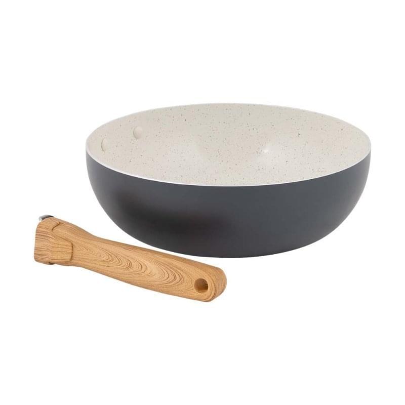 Quayside Wokpan van Bo-Camp met een afneembare handgreep om compact mee te nemen. Door het gebruik van aluminium is hij stevig en licht in gewicht. De keramische coating zorgt ervoor dat je de pan gemakkelijk kan schoonmaken, is krasbestendig en voorkomt aanbakken. Doordat je minder vet nodig hebt kook je automatisch gezonder.