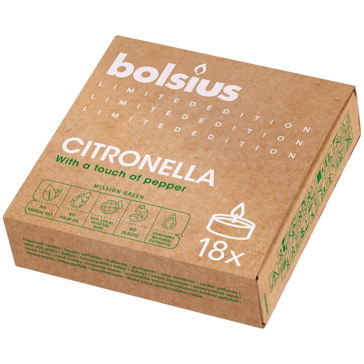 de geurtheelichten citronella met een vleugje peper perfect voor een avond om gerust buiten te zitten, zonder muggen. De theelichten van Bolsius zijn vrij van palmolie en plastic, en bestaan voor 50% uit plantaardige wax – een bewuste keuze voor mens én milieu.