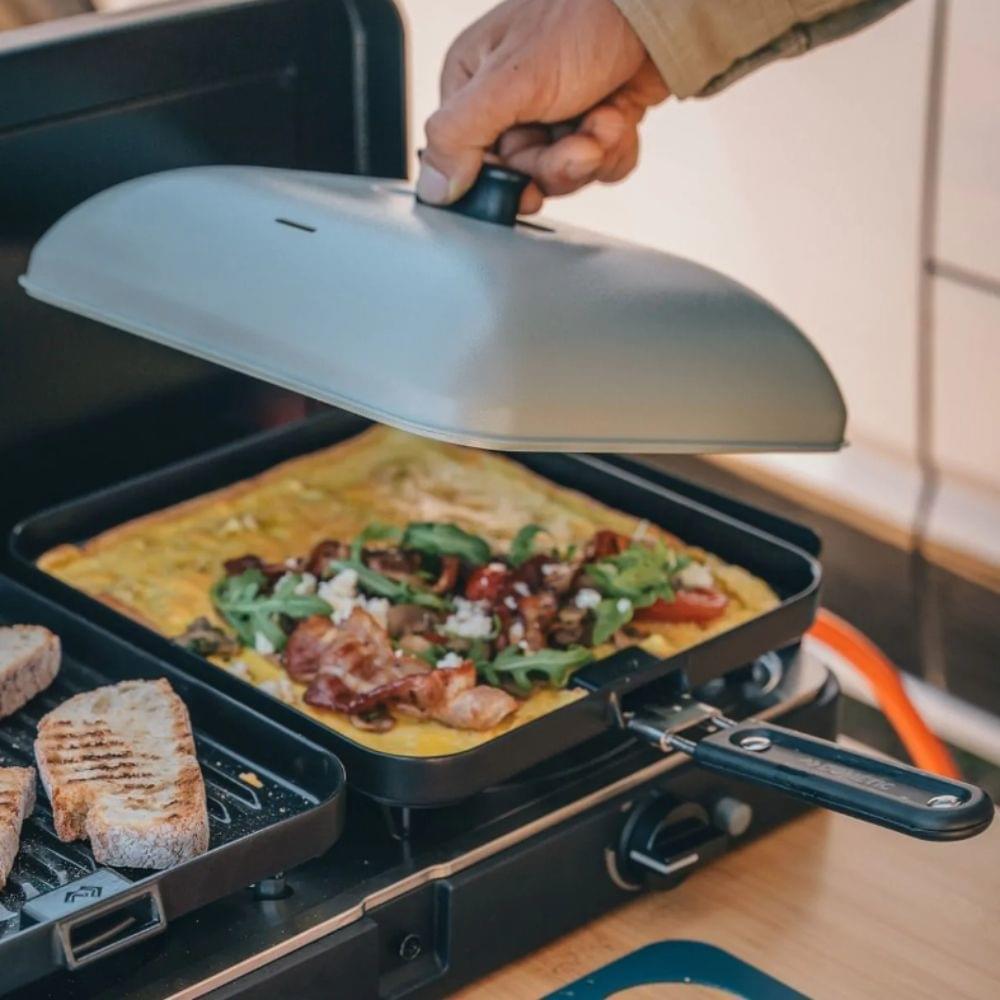 Door gebruik te maken van aluminium is dit Universele Deksel van Cadac lekker licht, maar behoudt hij perfect de warmte om zo de lekkerste gerechten te bereiden. Bovendien kun je op deze manier lekker spatvrij kokkerellen. De handgreep blijft koel zodat je geen handschoen hoeft te gebruiken. Hij past perfect op de Grill- en Bakplaten van de 2 Cook 3 toestellen.