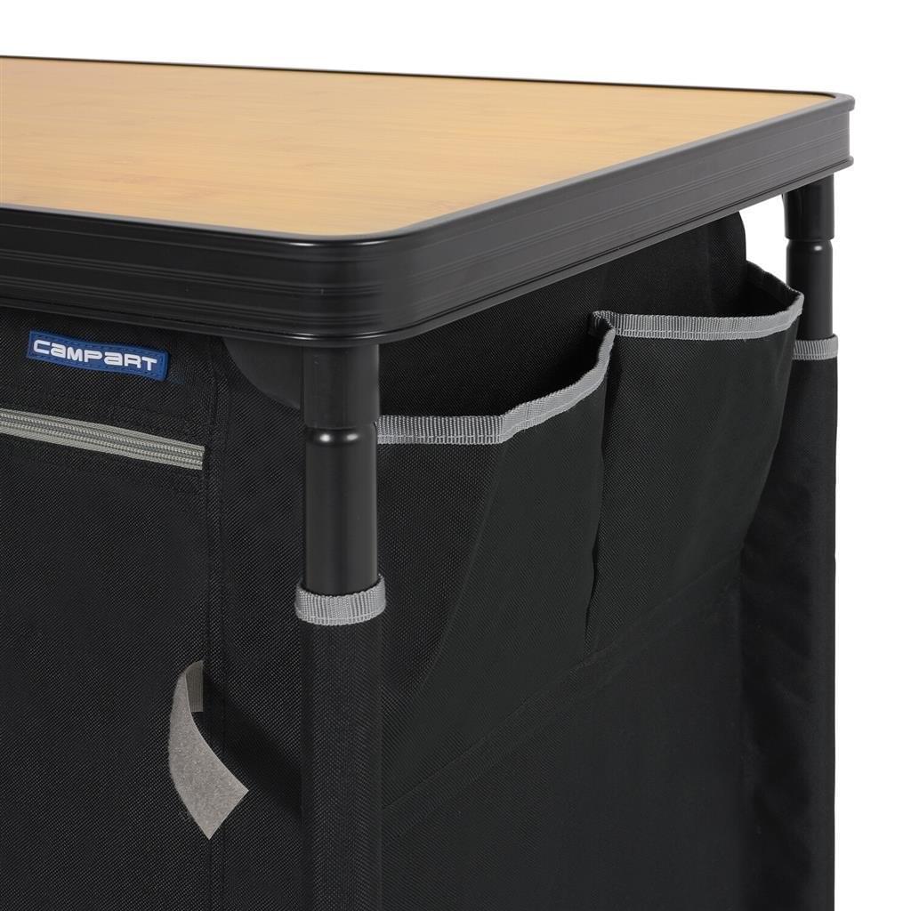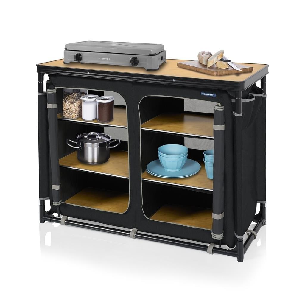 Laten we eerlijk zijn, ook op de camping kom je altijd ruimte te kort. Van Campart Travel is dit de Zaragoza campingkeuken. Een kast die je met zijn zes ruime vakken veel opbergruimte biedt. Aan de zijkant van de campingkast zitten nog twee kleine vakjes waar je bijvoorbeeld je keukengerei als de houten lepels kwijt kunt.