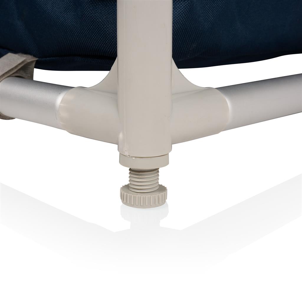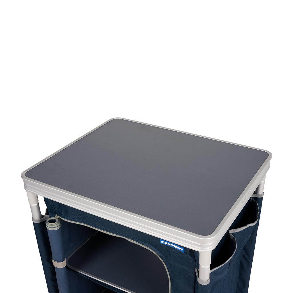 Het stevige aluminium frame en het sterke polyester zorgen ervoor dat de campingkast goed blijft staan, ook bij wat onstuimiger weer. De achterkant is voorzien van gaas voor ventilatie, zodat je spullen fris blijven. De vier verstelbare poten zorgen voor extra stabiliteit op ongelijke ondergrond, en het tafelblad is makkelijk schoon te maken. Een praktische oplossing voor wie georganiseerd wil kamperen.