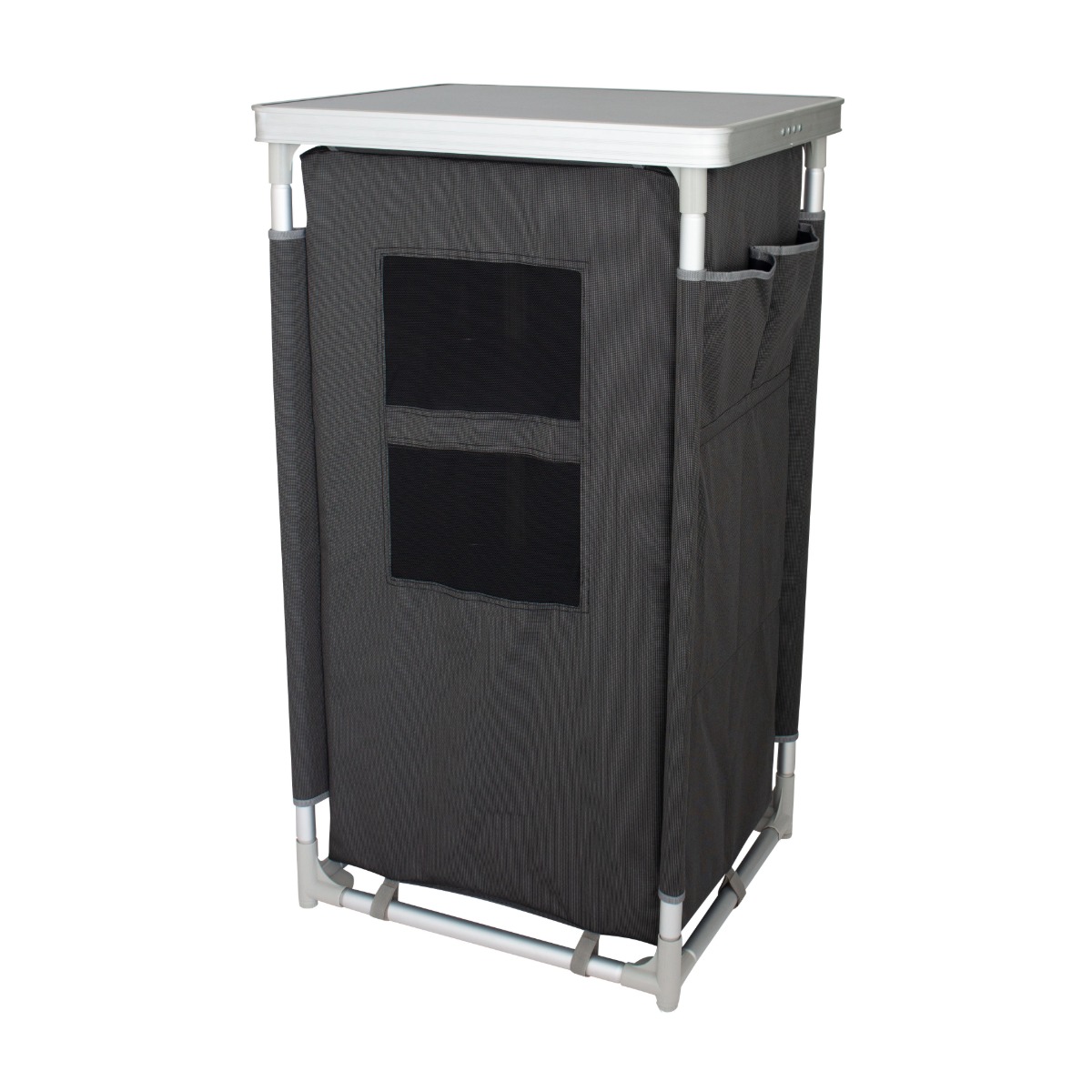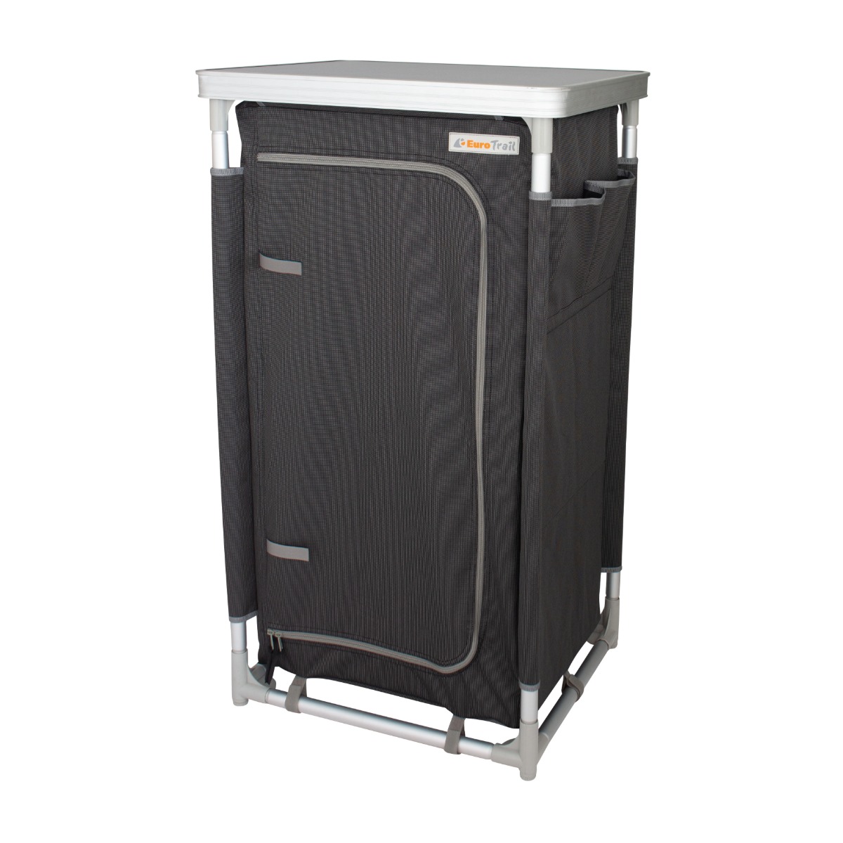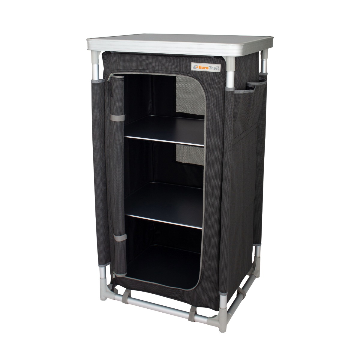 Met de campingkast Nice van Eurotrail heb je een ideaal klein kastje voor op de camping. Met meerdere planken en een stevig oplegblad biedt deze solide kast voldoende ruimte om je campingspullen in op te bergen.