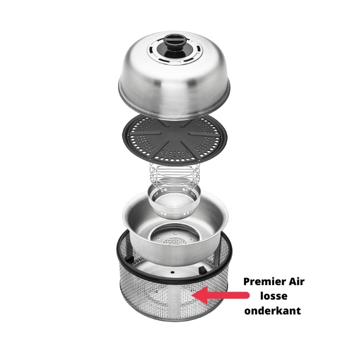 Deze losse RVS mantel is ter vervanging van je oude Onderkant van de Cobb Premier Air. Hij wordt geleverd met kunststof ring en vier rubbertjes waar de kom op ligt en aan de onderzijde zitten nog eens drie rubbebren voetjes.
