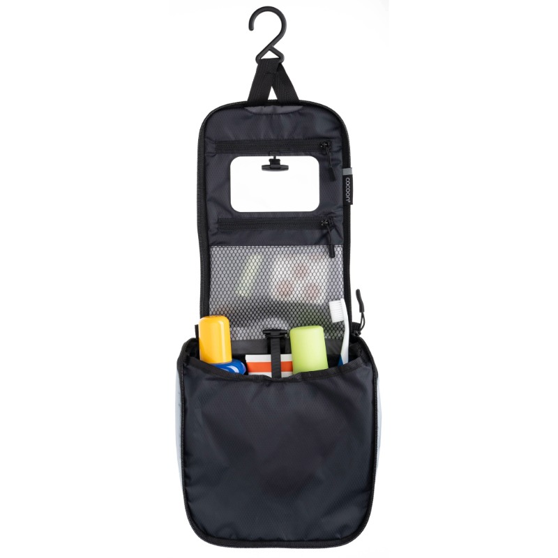 In de 2 ruime vakken kan je al je grote tubes of flessen kwijt. Al je kleinere toiletartikelen kun je in de handige vakken met rits doen in de flap aan de voorzijde. Cocoon heeft bij de Allrounder ook aan een spiegeltje gedacht. Eenmaal klaar met opfrissen of opmaken, rits je de tas eenvoudig dicht en neem je hem zo mee aan het ruime handvat.