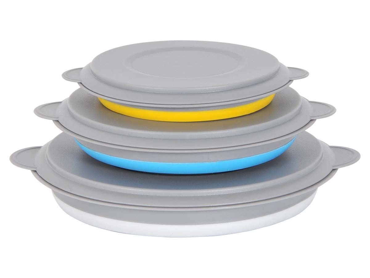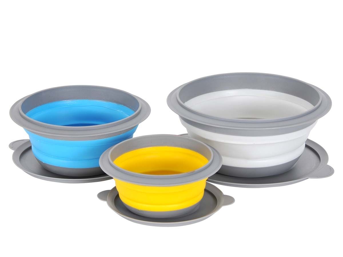 De schalen zijn gemaakt van kunststof met een flexibel siliconen tussenstuk, waardoor ze eenvoudig in te klappen zijn. Zo nemen ze nauwelijks ruimte in in je kampeeruitrusting of rugzak. Wanneer je ze nodig hebt, klap je ze in een handomdraai uit tot volwaardige schalen.