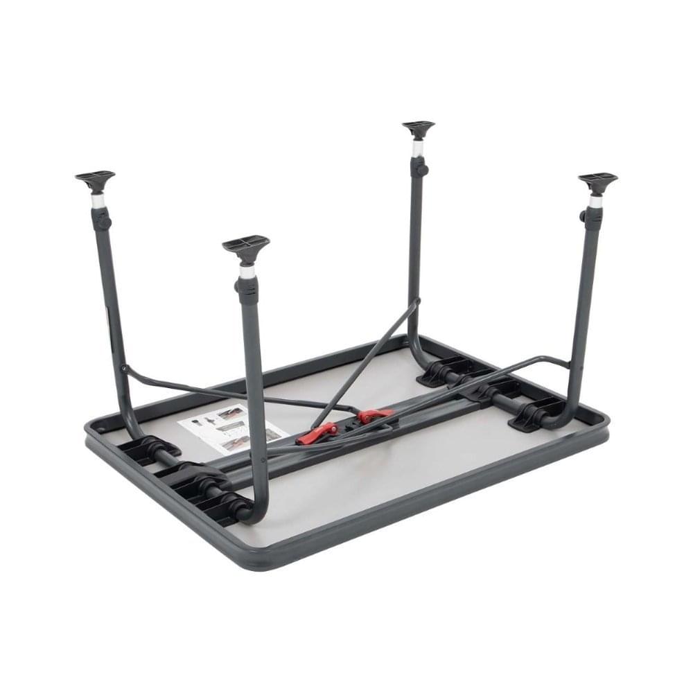De poten zijn van gepoedercoat aluminium en voorzien van traploos verstelbare poten met stabilisatie voetjes zodat je op elke ondergrond stevig staat. Je hebt deze kampeertafel in een mum van tijd uitstaan door het simpele verstelsysteem.