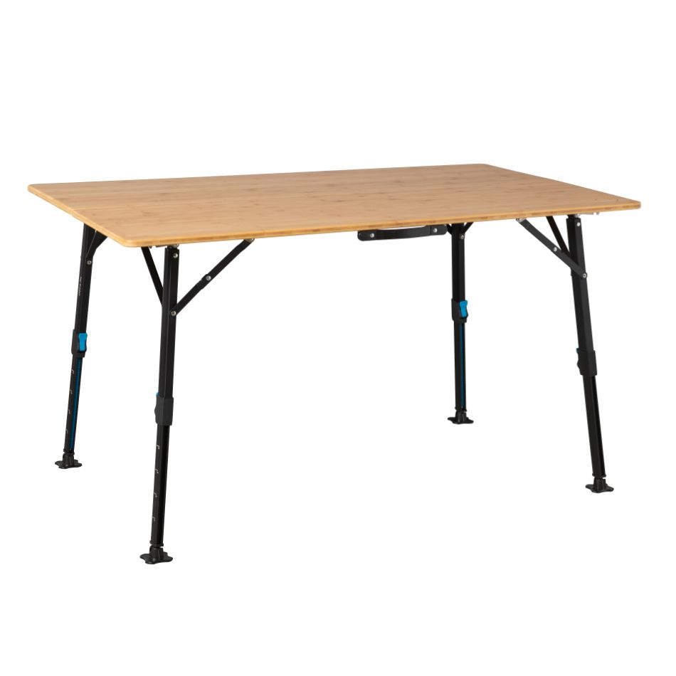De Bamboe 120 x 72 cm Campingtafel is de vernieuwde versie van Defa. Er is weinig veranderd behalve dat de traploos verstelbare poten nu van zwart aluminium zijn. Deze zijn voorzien van het nieuwe Blue Line Klemsysteem. Dit maakt de kampeertafel heel handig in gebruik. Het bamboe blad ziet er leuk uit en is in tweeën deelbaar zodat je hem makkelijk mee kan nemen als koffer.