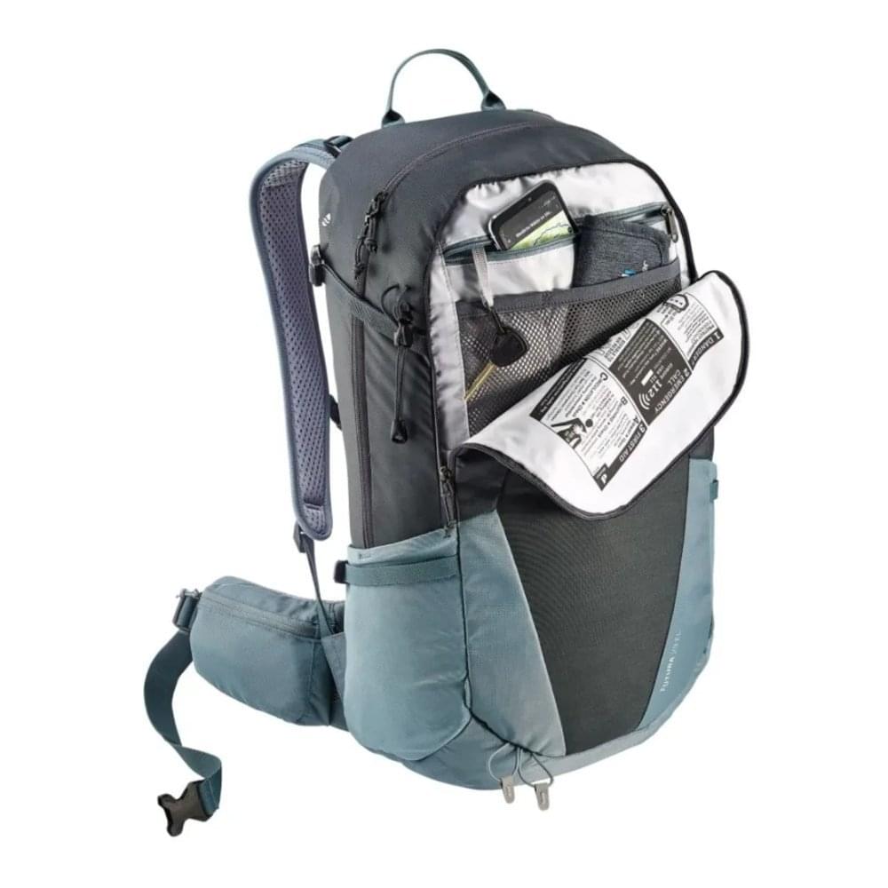 Hij is bovendien geschikt voor een drinksysteem van 3 liter en wordt geleverd met een regenhoes. Daarnaast beschikt de rugzak over pull-forward heupvinnen, een steekvak aan de voorkant en een elastisch binnenvak voor natte kleding of een waterzak.