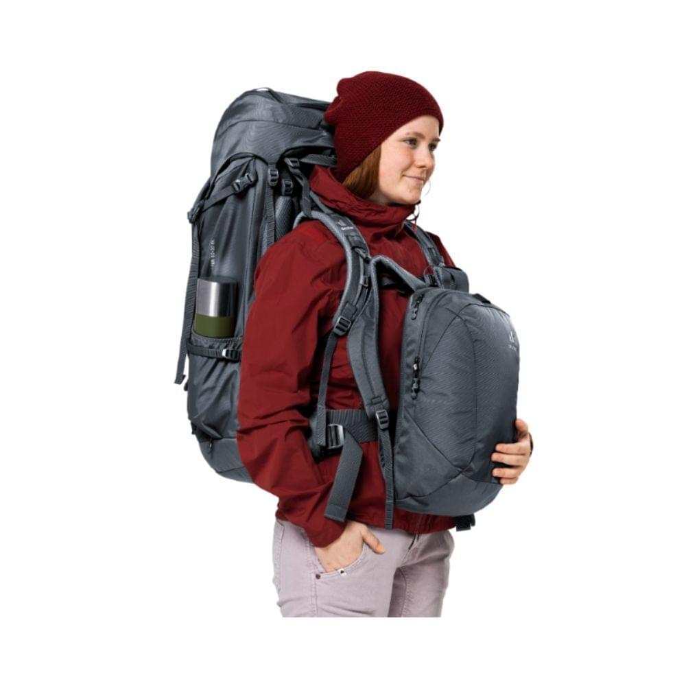 Met de Voyager van Deuter heb je alles wat je nodig hebt. Het is een ruime backpack van 60 liter die je kunt uitbreiden tot 70 liter door middel van de klep die uit te rollen is. En dat is niet het enige... Hij heeft namelijk een geïntegreerde dagrugzak die je aan de hoofdrugzak kunt vastmaken aan de schouder om aan de voorkant te dragen. Of je neemt hem gewoon los mee voor een dagtocht.