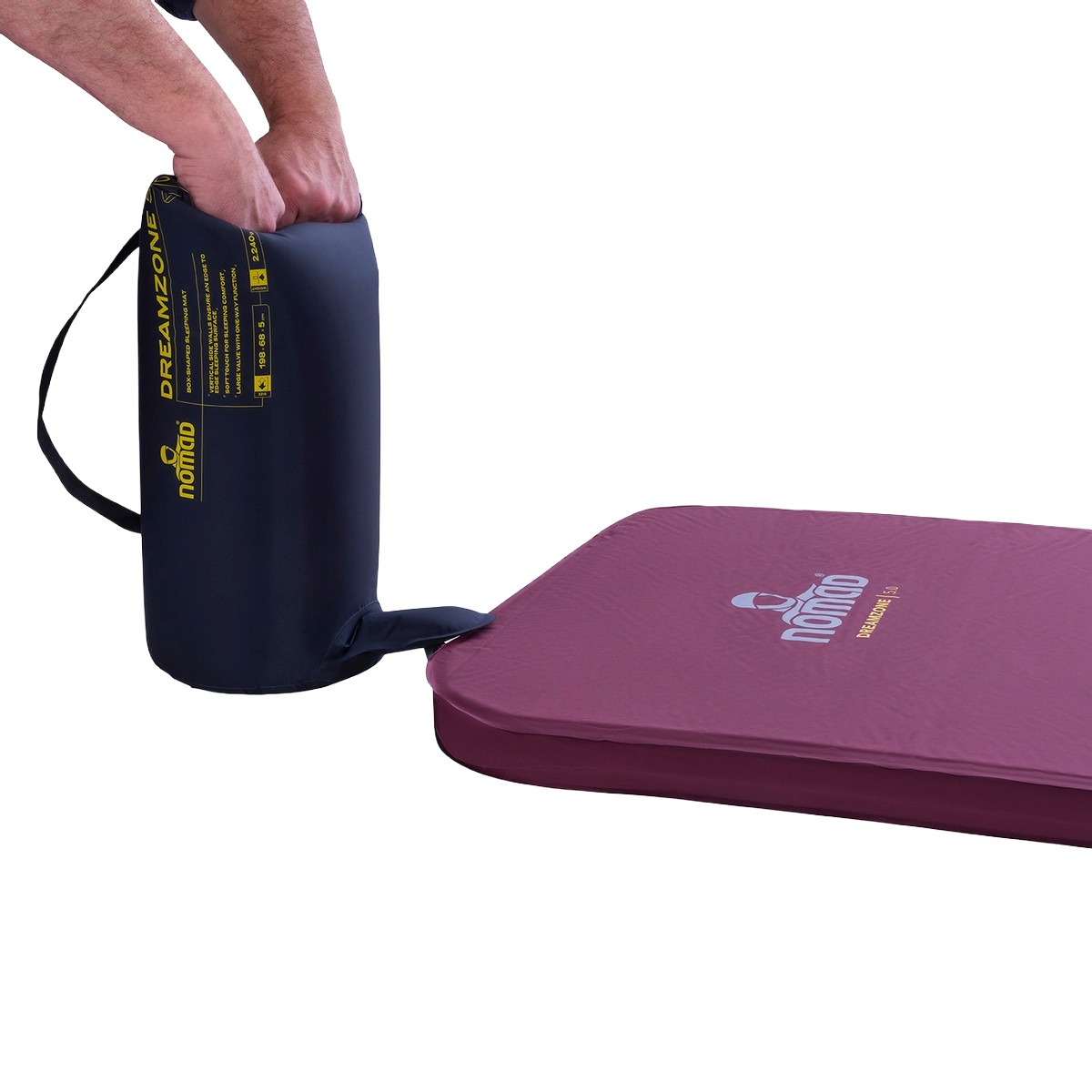 De Dreamzone 5.0 van Nomad heeft één groot ventiel waarmee je de mat gemakkelijk op kunt blazen en leeg kan laten lopen. Dit ventiel is in drie standen te gebruiken; open, inflate en deflate. De inflate stand kun je gebruiken om met de stuffzak de mat eventueel wat bij te blazen. Je hebt dus geen aparte pomp nodig. Er is ook overal aan gedacht.