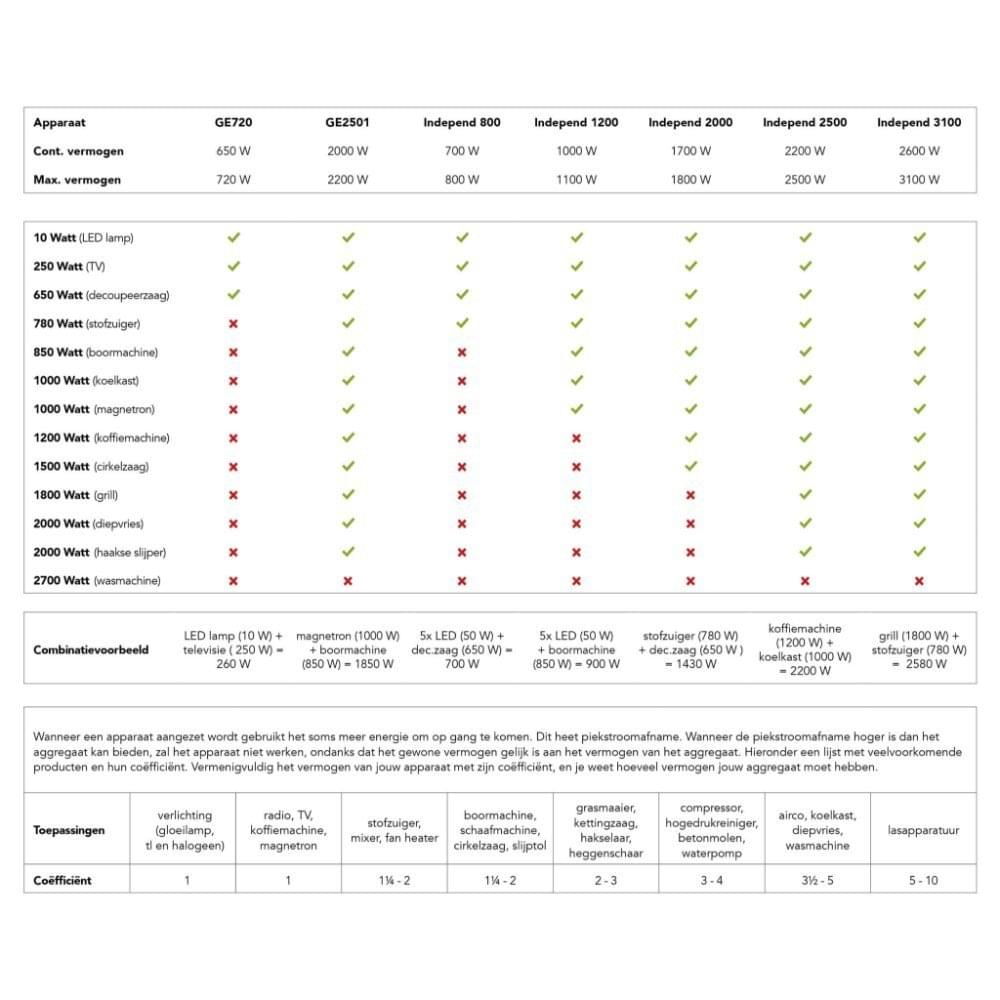 De benzine aggregaat is voorzien van een 230V AC- en een 12V DC-aansluiting, waardoor je hem in veel situaties kan gebruiken. Dankzij zijn relatief lichte gewicht van 12 kg en compacte formaat is hij eenvoudig op reis mee te nemen. Door middel van de handmatige start is de Independ 1200 aggregaat ook erg gemakkelijk in gebruik. En dankzij de kunststof behuizing hoef je niet bang te zijn dat de motor snel beschadigd.