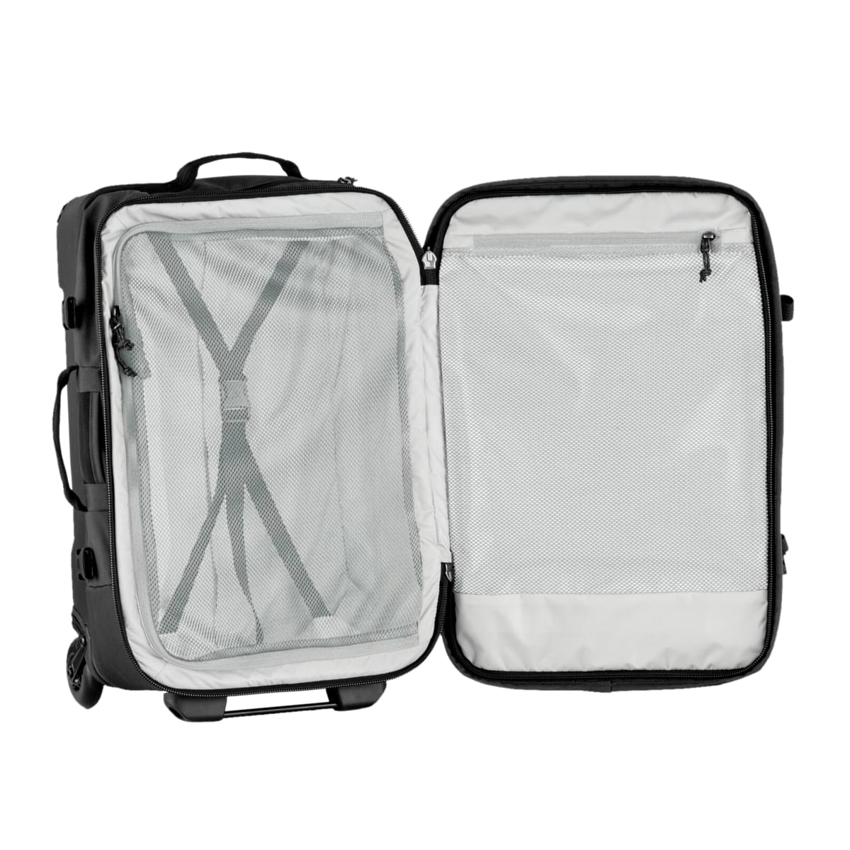 De licht gewatteerde voorkant biedt extra bescherming voor de inhoud, terwijl het buitenvak aan de bovenkant is ontworpen om je spullen niet te pletten, zelfs als de reistas vol is. De buitenkant is voorzien van compressiebanden, en de binnenkant beschikt over koorden en een verdeler met meshvakken om alles netjes op zijn plek te houden. Deze rolkoffer van Fjällräven is ook verkrijgbaar in een 75 liter uitvoering.
