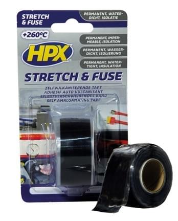 De Stretch & Fuse tape van HPX is een zelfvulkaniserende siliconentape. Zelfvulkaniserend wil zeggen dat de tape de eigenschap heeft om bij contact met zichzelf samen te smelten. Door deze samensmelting wordt de tape automatisch lucht- en waterdicht. Hierdoor is de tape zeer goed toepasbaar om elektrische bedrading te isoleren en om een permanente waterdichte afdichting te maken. De tape is te gebruiken op alle ondergronden en makkelijk te verwijderen.