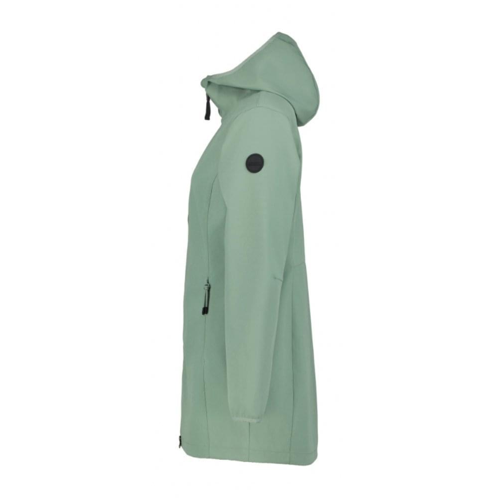 Wat prettig is aan deze softshell jas is dat hij een wat langere rug heeft en als je de capuchon opzet sluit deze goed aan door het elastiek in de rand rond je gezicht.