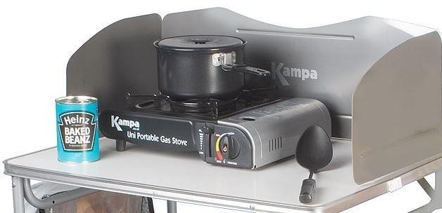 Met het universele kookwindscherm van Kampa houd je de wind weg bij het koken. Zo waait de vlam van je kooktoestel niet uit. Ook voorkomt het windscherm dat de meeste warmte wegwaait in plaats van dat het de pan verwarmt. Zo kook je sneller en comfortabeler. Het kookwindscherm past op de meeste campingkeukens en om de meeste koektoestellen. Na gebruik is het windscherm op te klappen. Het scherm wordt bevestigd door middel van zuignappen, zodat het scherm stevig staat en het tafelblad niet beschadigd.