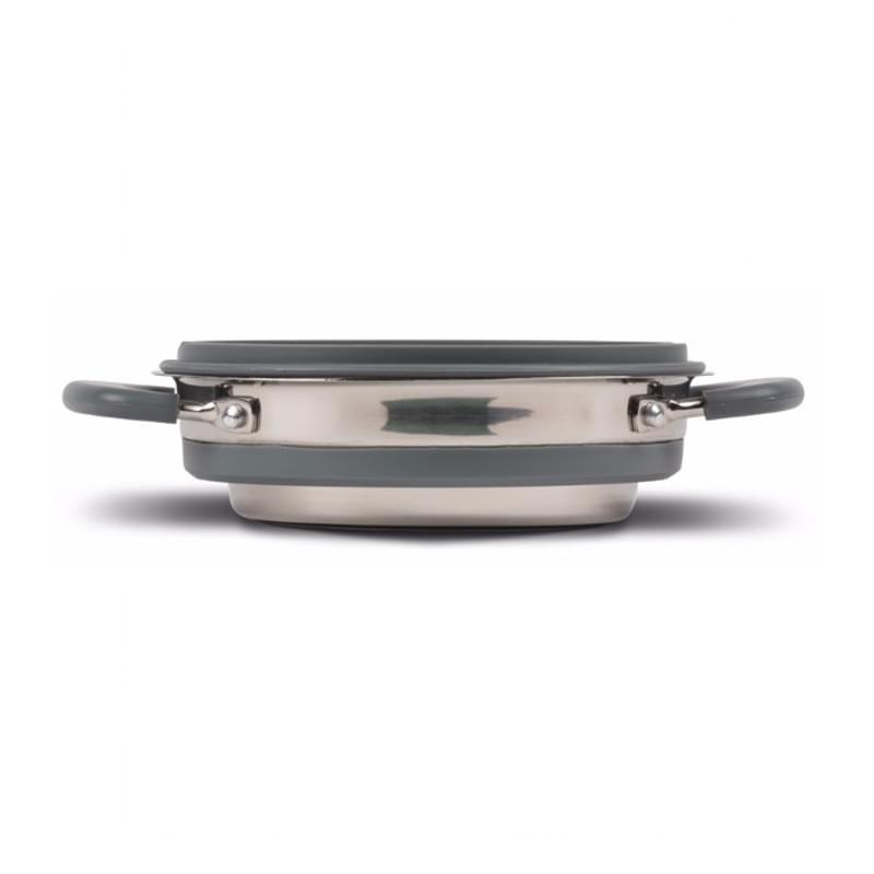 Deze opvouwbare pan van Kampa bespaart een hoop opbergruimte. Een groot deel van de pan kan namelijk opgevouwen worden, waardoor deze half zo hoog wordt. Ideaal wanneer je niet veel opbergruimte hebt, zoals bijvoorbeeld op de camping. De pan heeft een inhoud van 1 liter en wordt geleverd met glazen deksel en geïsoleerde handvaten. De pan zelf is gemaakt van RVS in combinatie met siliconen (hittebestendig, smaakloos, geurloos).