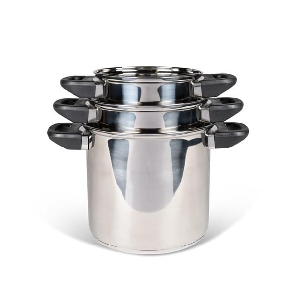De Space Saver pannenset van Kampa is zo ontworpen dat de pannen gemakkelijk in elkaar kunnen worden opgeborgen. Alle pannen hebben een deksel en hittebestendige handgrepen. Anders dan door Kampa aangegeven wordt zijn deze pannen niet op inductie te gebruiken, de bodem is niet vlak en niet magnetisch.