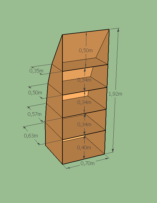 De kast is 70 cm breed en de vakken zijn 34 cm hoog. Door de vorm van de tent zijn de dieptes van de vakken verschillend. Alle maten vind je ook bij de afbeeldingen van de kast.