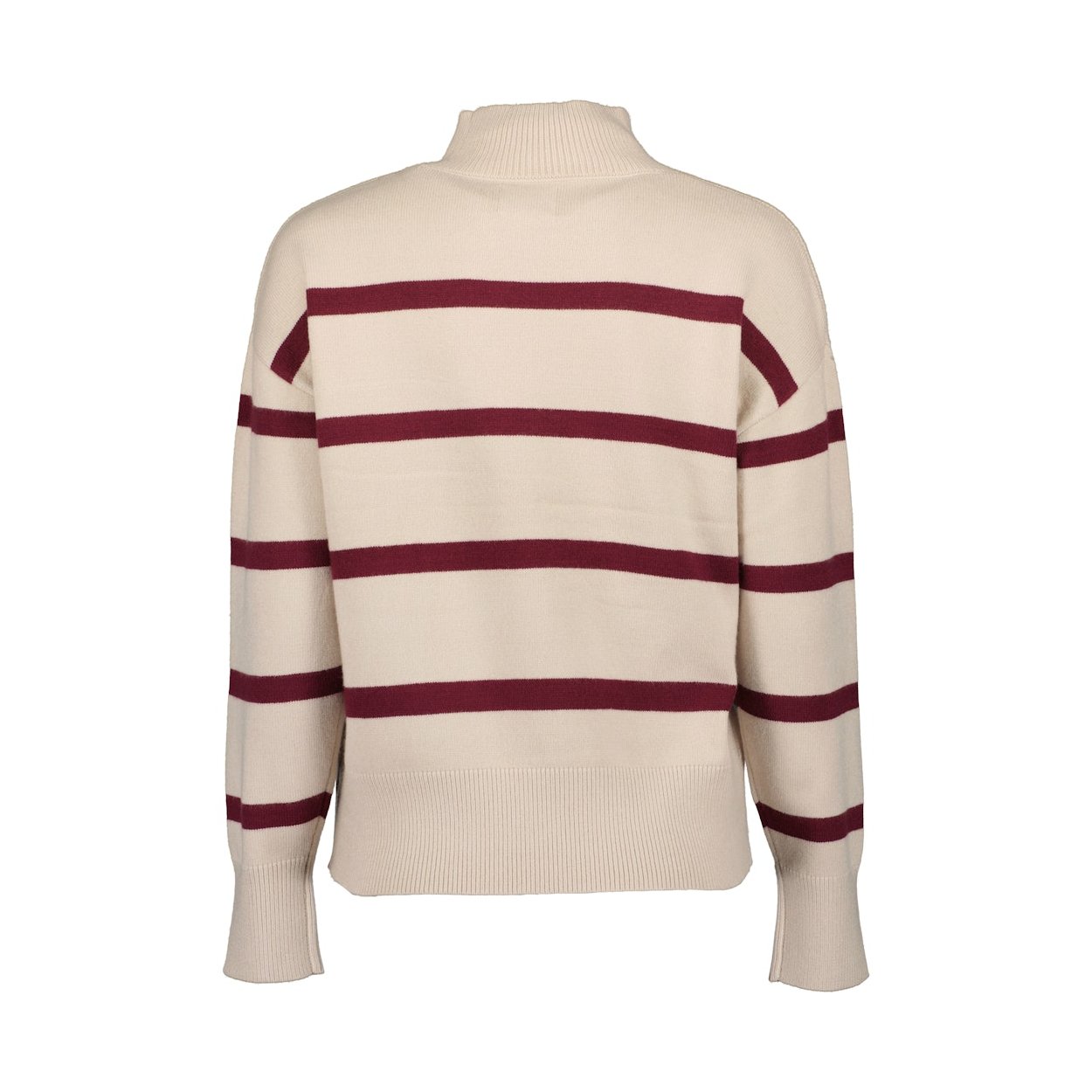 Gebreide trui van Blue Seven die aansluitend op de heupen valt. Hierdoor is de Mockneck Striped trui prima combineren met een rok of broek.