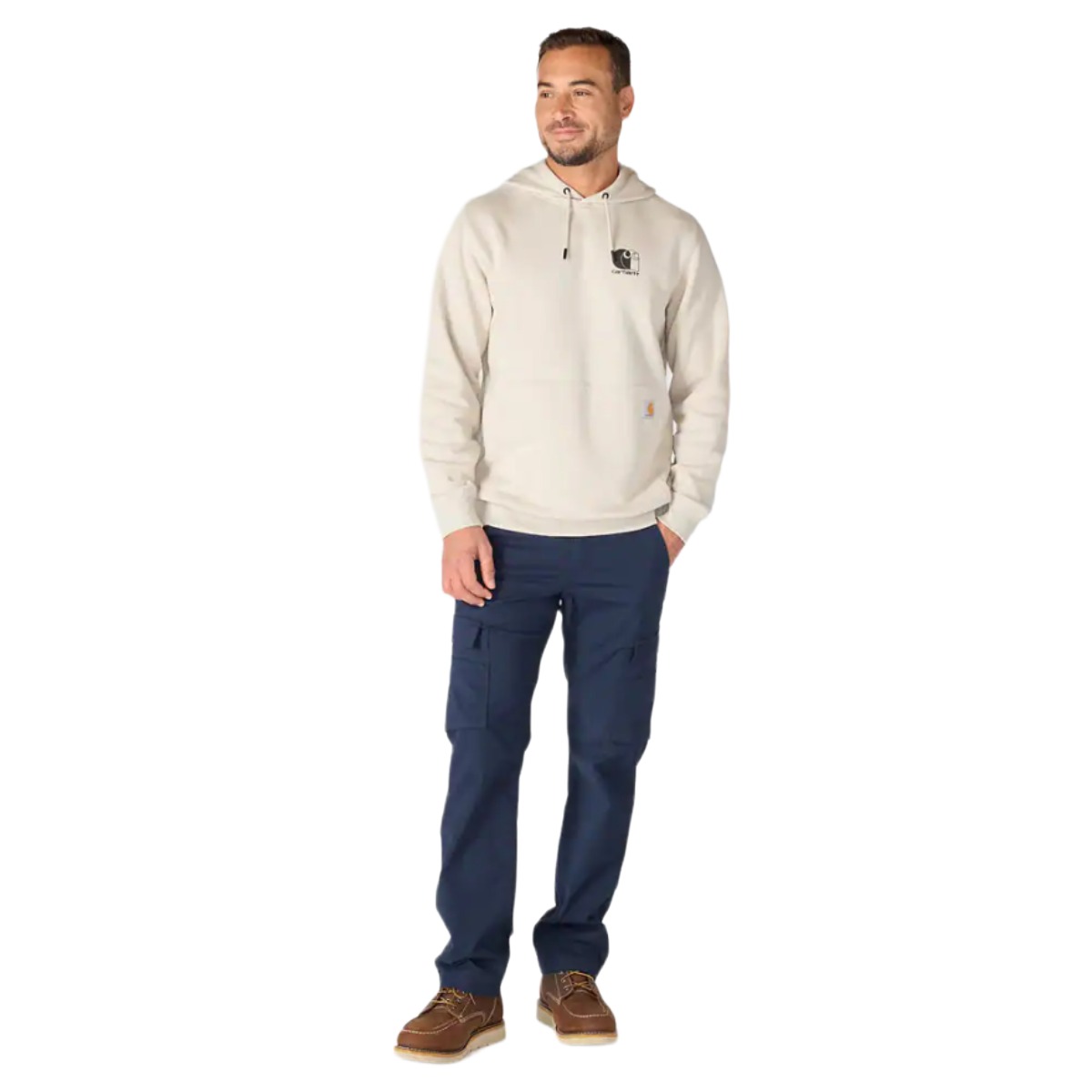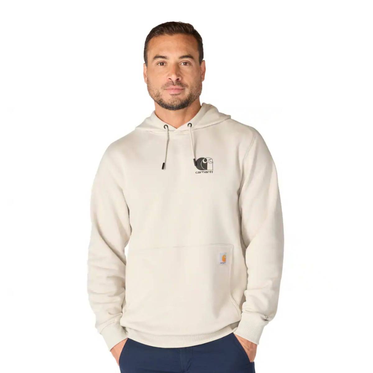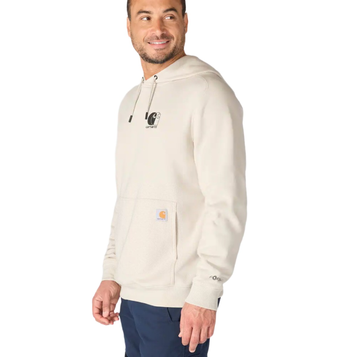 Dankzij de FastDry-technologie wordt zweet snel afgevoerd, zodat je koel en droog blijft als het tempo omhooggaat. De vaste capuchon biedt extra comfort op frisse dagen en in de kangoeroezak berg je makkelijk kleine spullen op. De Carhartt Double C-print op de borst geeft de hoodie een sportieve, herkenbare look.