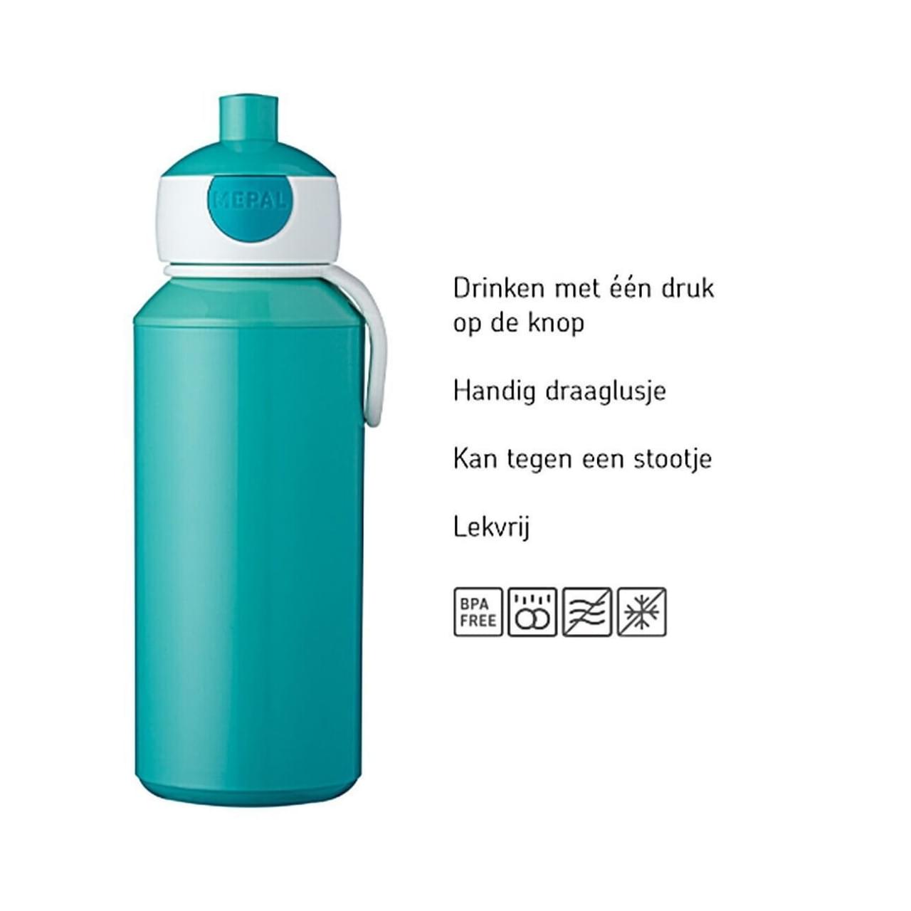 Deze Mepal Campus drinkfles heeft een zogeheten pop-up drinktuit. Door op een knopje te drukken schiet het tuutje omhoog en kun je drinken. Wanneer je klaar bent druk je het tuutje weer terug en sluit de fles automatisch. De drinkfles is lekvrij en BPA-vrij. Daarnaast kan de Pop-Up fles in zijn geheel de vaatwasser in en is de dop voor een grondige schoonmaak ook eenvoudig uit elkaar te halen.