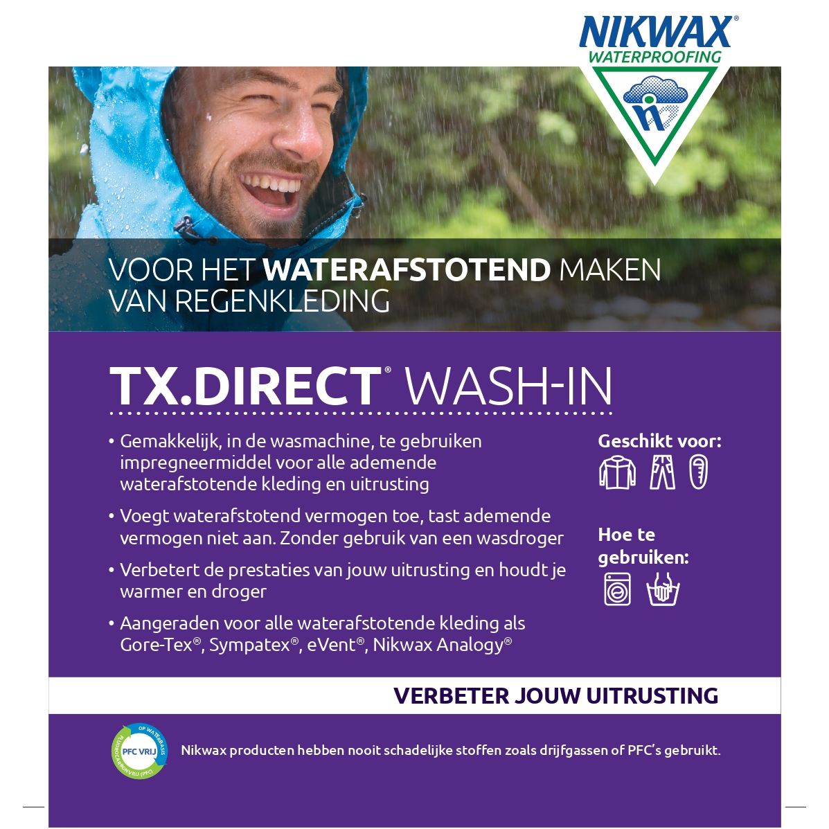 Stop het schone kledingstuk in de wasmachine. Doe Nikwax TX Direct Wash-in via het wasbolletje of het zeepbakje in de wasmachine. Selecteer een normaal wasprogramma, start en draai een compleet programma. Of gebruik Nikwax eenvoudig in de handwas. Ophangen om te drogen of als het wasvoorschrift het toestaat op en lage stand in de wasdroger.