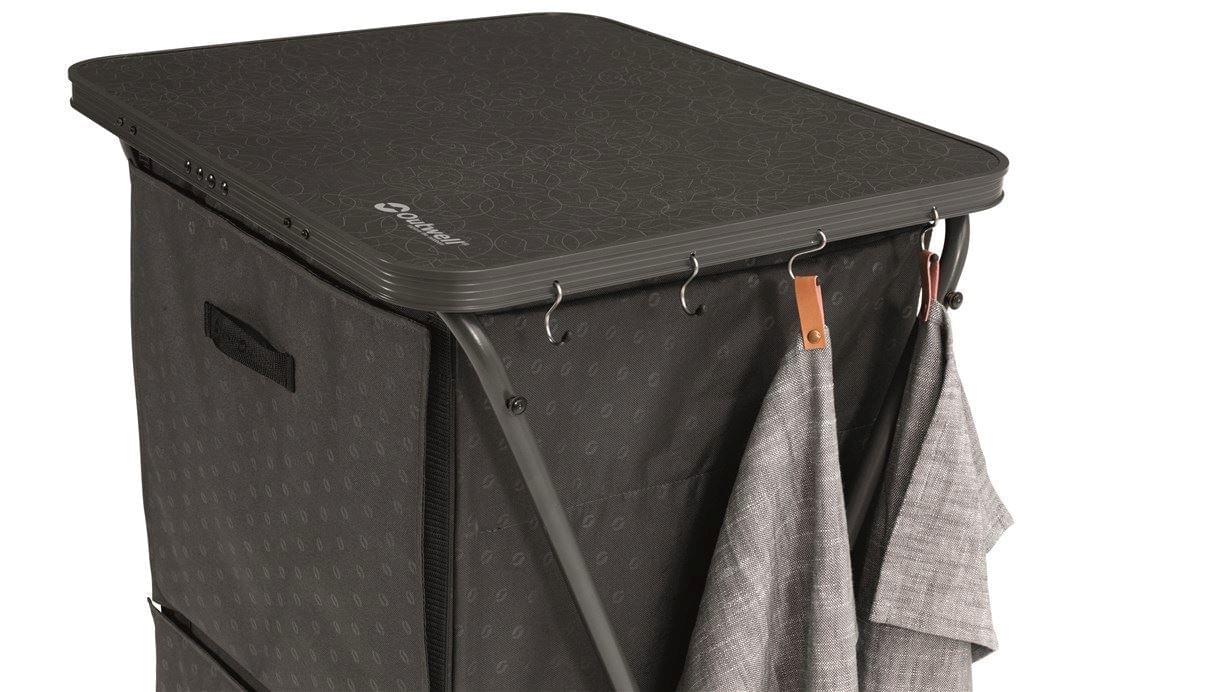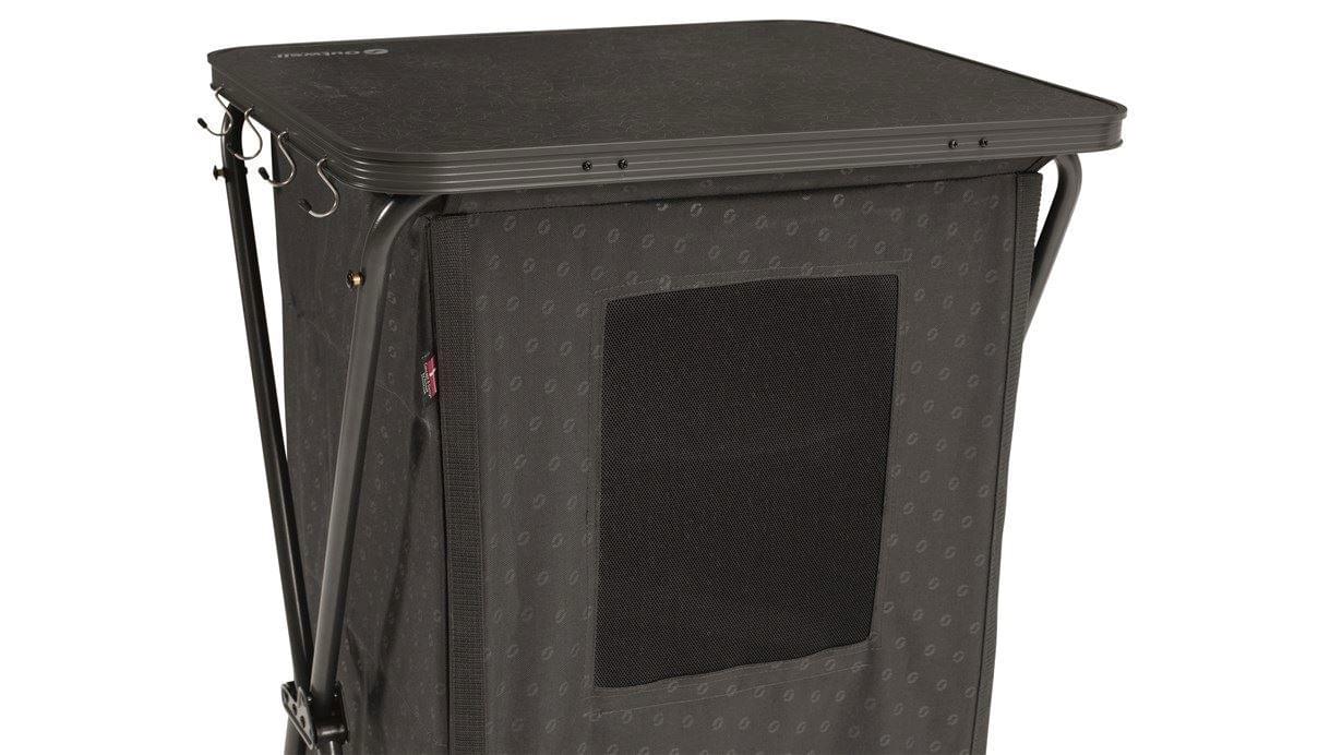 De campingkast heeft drie uitneembare planken waarvan twee grote massieve planken met een draagvermogen tot 10 kg per plank, en een gaasplank bovenin met een draagvermogen tot 5 kg. Verder zit aan de zijkant van de kast een klein opberg vak waar je bijvoorbeeld je bril of wat zonnebrand in kwijt kan. De ophanghaken aan de zijkant bieden plaats voor een handdoek of theedoek. Voor nog meer opbergruimte zijn er ook bevestigingspunten gemaakt aan de zijkant voor de Neat'N'Tidy organisator M (optioneel verkrijgbaar).
