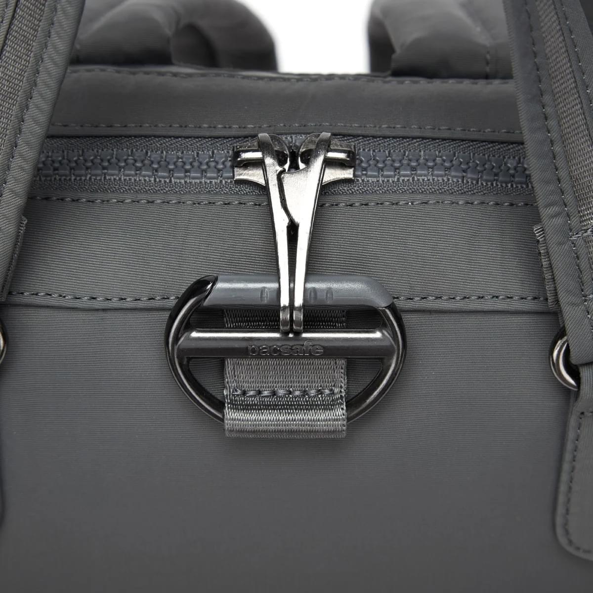 Deze tas van Pacsafe heeft veel technische aspecten die diefstal of het lekken van privacygevoelige gegevens kunnen voorkomen. Zo heeft hij RFID-beschermende vakken, wat inhoudt dat een dief niet van buitenaf de magneetstrip van je creditcard kan scannen. Er zit een haak aan de rugzak waar je de rits aan kan bevestigen, zodat het meer handelingen nodig heeft om hem open te maken. Ook kun je de rits aan elkaar vastmaken. Met de speciale eXomash Slashguard voering is de stof beschermd tegen het doorsnijden met een mes. Daarnaast kun je de tas ook ergens aan vastketenen, bijvoorbeeld aan een tafelpoot, door het slot op de schouderband.