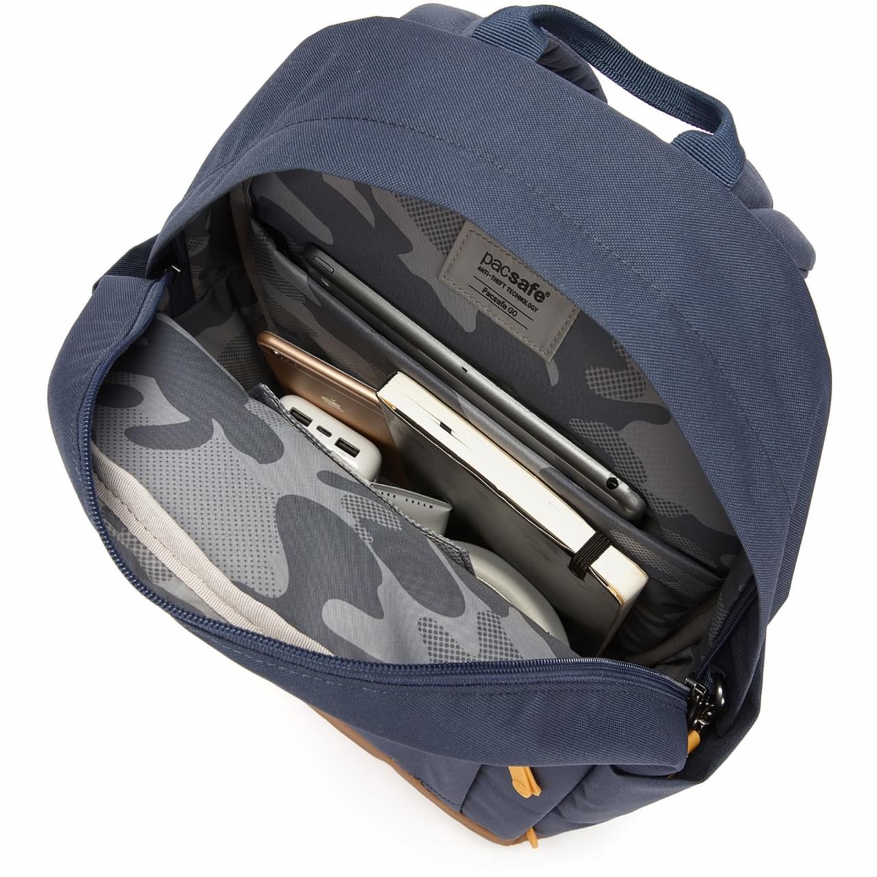 De rugzak van Pacsafe is gemaakt van 21 PET-flessen en is voorzien van diverse anti-diefstal functies. Zo is de tas gevoerd met het eXomesh Slashguard materiaal wat voorkomt dat de tas open gesneden kan worden en kan de rits afgesloten worden. Ook de schouderband heeft een soort slot waarmee je hem bijvoorbeeld aan een stoel vast kunt ketenen. In de anti-diefstal tas bevind zich ook een RFID-pocket. Hierin zijn je pasjes en identiteitsbewijs beschermt tegen ongewild scannen.