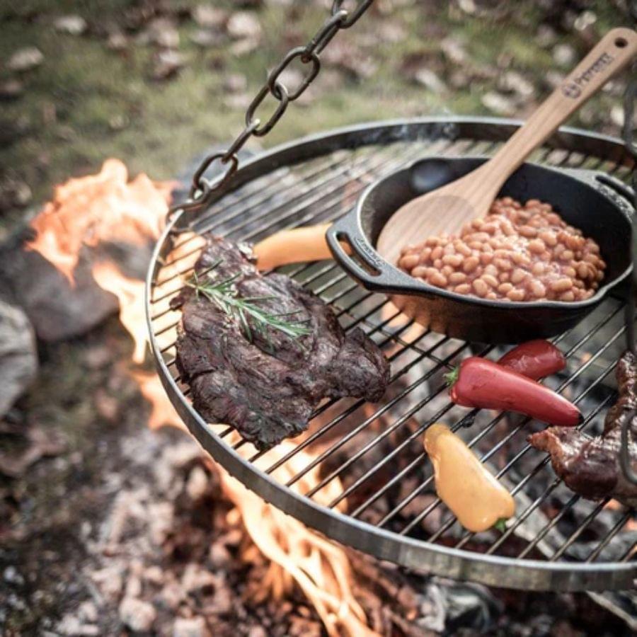 Kampvuur aan, tent opgezet en moe van de dag klaar om een lekkere maaltijd te bereiden. Nadat je tripod hebt opgezet hang je deze Hangende Grillrooster aan zijn sterke, stabiele kettingen en maak je van je vuur een heuse buitenkeuken. Met een oppervlak van 50 cm kun je naast grillen ook rustig alvast de kan voor koffie erbij zetten en nog genoeg ruimte overhouden voor je vlees en/of groente. Door de natuurlijke beweging en aanwezigheid van de wind in de vlammen wordt de warmte goed verdeelt en blijft je eten sappig en mals. Ook kun je zelf het rooster een kleine beweging geven, de verhoogde rand zorgt ervoor dat er niks afglijdt.