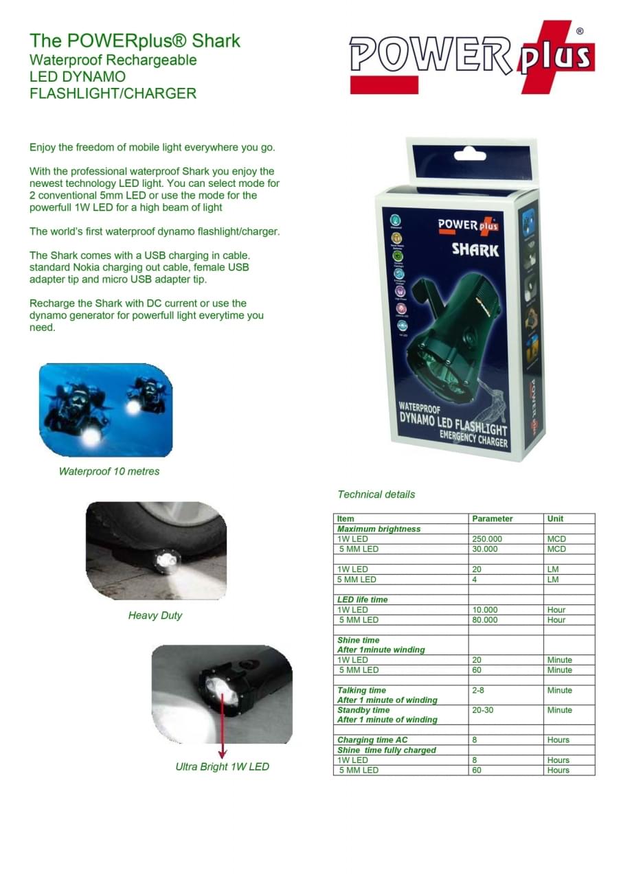 Powerplus - Shark LED Waterproof Dynamo Oplaadbare Zaklamp