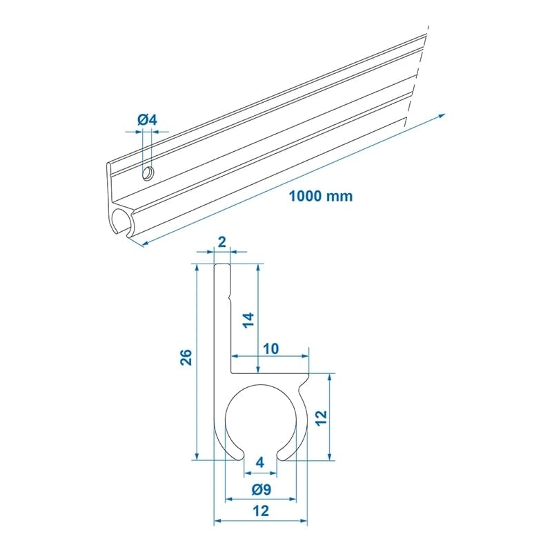 Deze ProPlus Tentrail is voor het bevestigen van pezen van luifels, tochstroken, wielflappen en voortenten. Gemaakt van licht Aluminum en inclusief 6 gaten en schroeven voor de bevestiging.