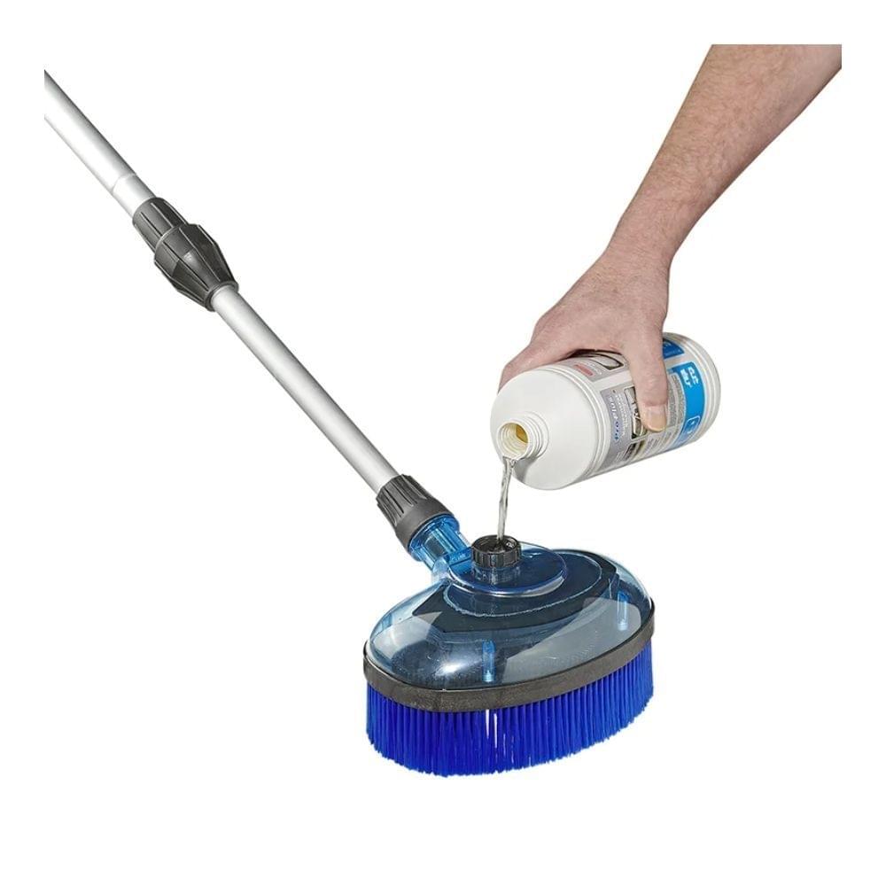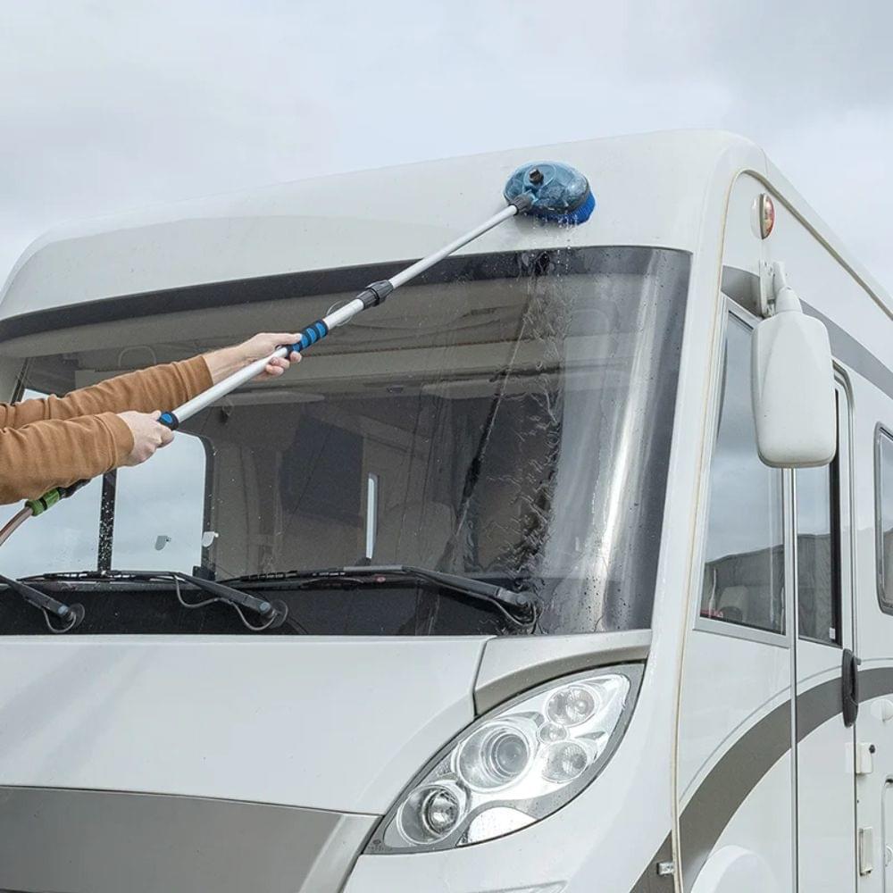 Deze Wasborstel van ProPlus vul je met zeep, stel de juiste hoogte in door middel van een Telescopische Steel, sluit je tuinslang er op aan en je hebt de perfecte schoonmaaktool voor je camper, caravan, busje of auto. Door de waterdruk roteren de drie borstels in kop waardoor het oppervlak nog beter schoon wordt.
