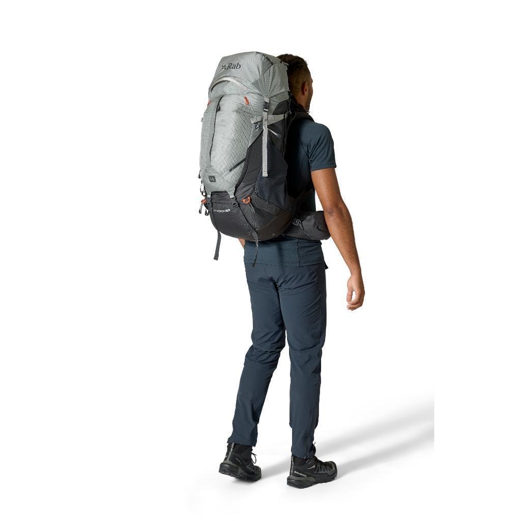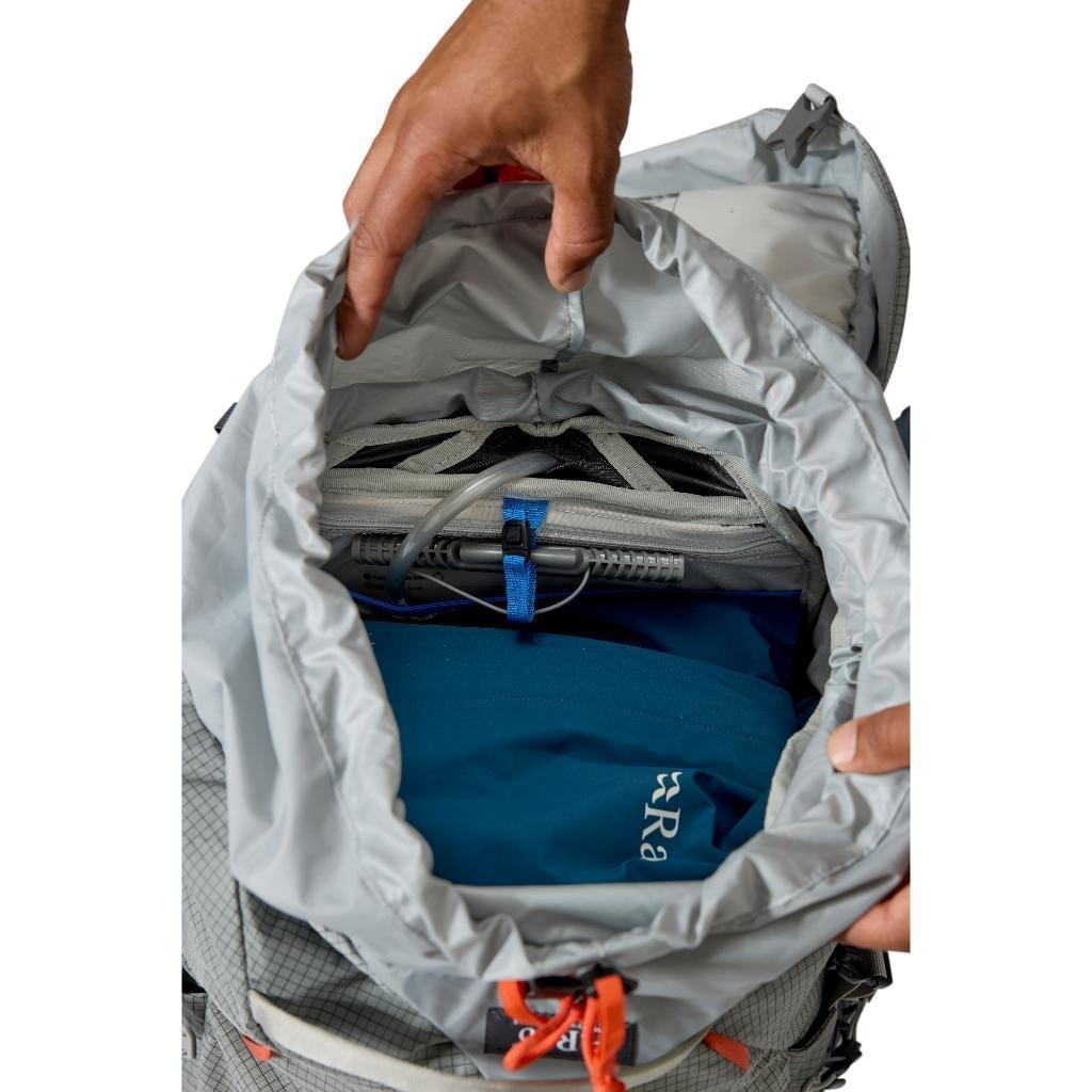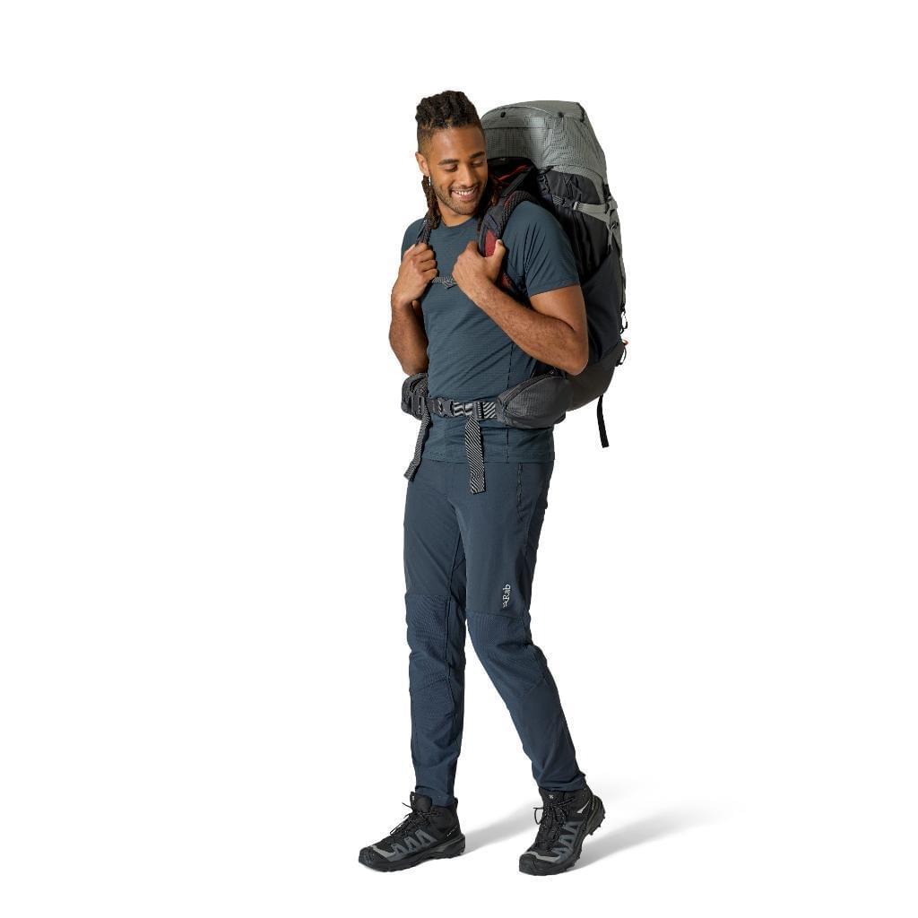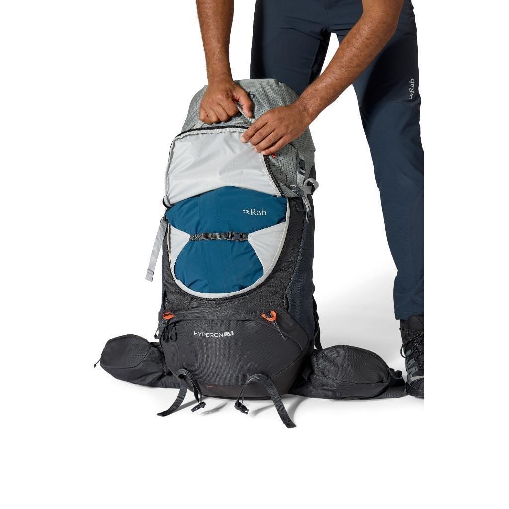De heupband van de RAB Hyperon beweegt mee met je heupen, wat zorgt voor meer bewegingsvrijheid en minder schuren. Dit helpt de tas stabiel te houden, zelfs op oneffen terrein. De rugzak is gemaakt van sterk ROBIC® nylon met Spectra® ripstop, waardoor hij bestand is tegen ruige omstandigheden en langdurig gebruik.