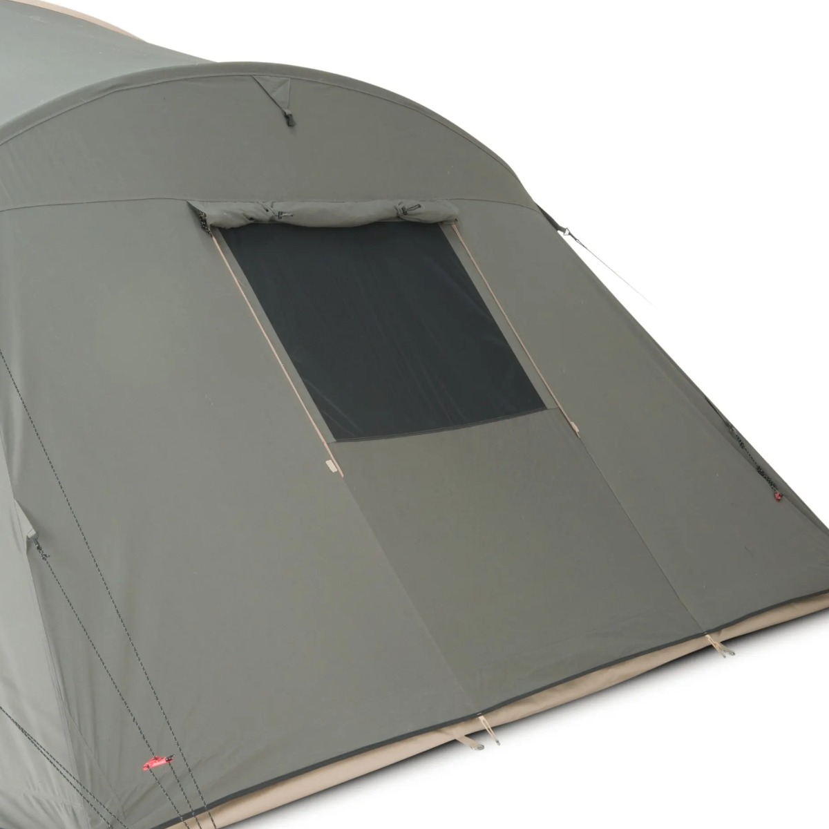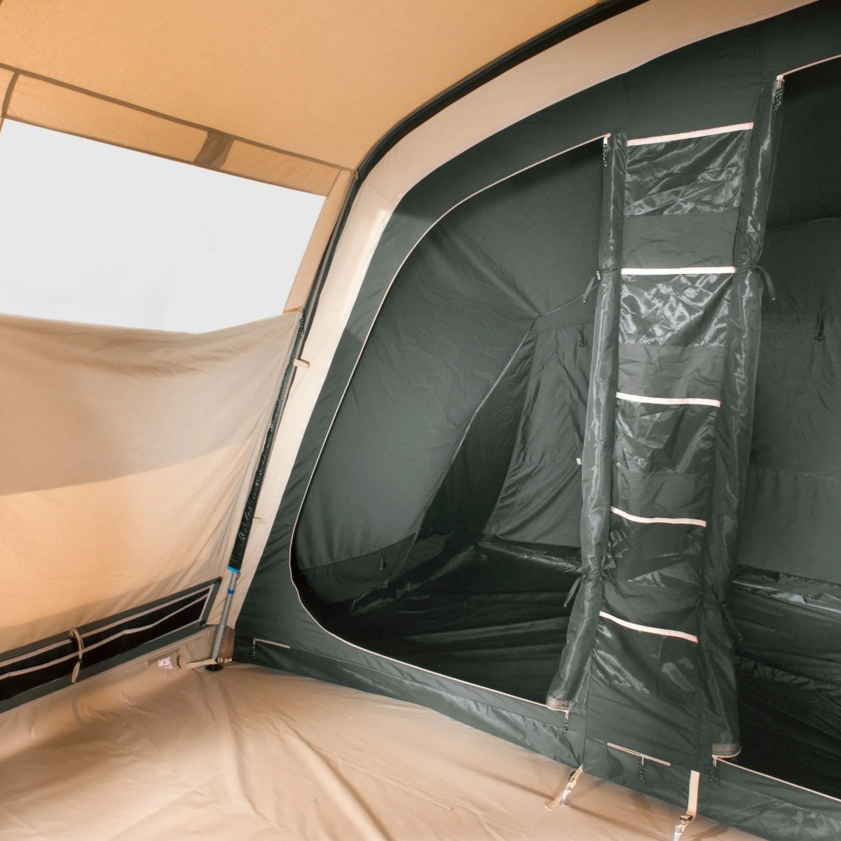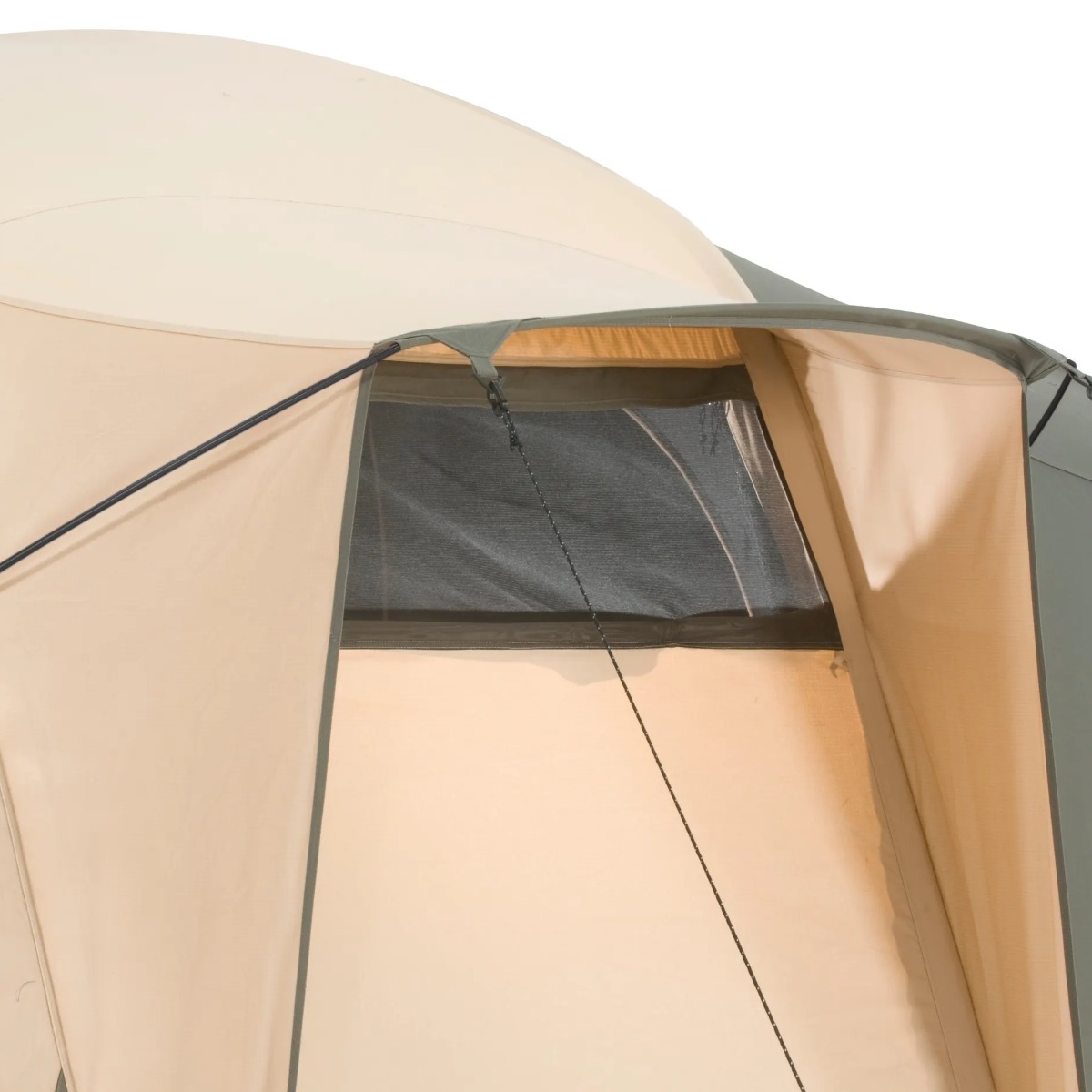 Ventilatie is bij deze tent uitstekend geregeld. Aan de achterzijde en zijkanten zitten ventilatieopeningen die continu open blijven voor een constante luchtcirculatie. Dit draagt bij aan een prettig leefklimaat en helpt condensvorming te verminderen. De zij-ingang is bovendien voorzien van een grote hordeur, zodat frisse lucht binnenkomt terwijl insecten buiten blijven.