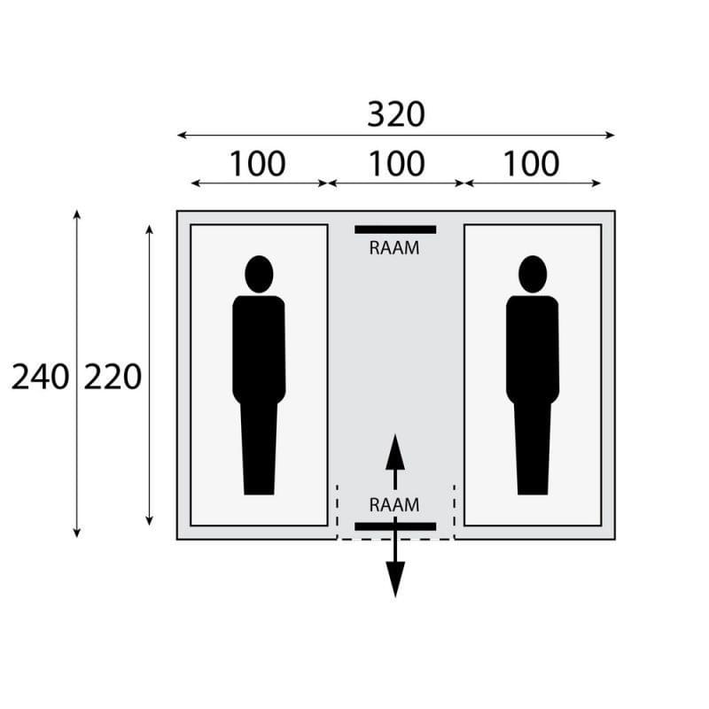 Deze bijzettent beschikt over veel ruimte. Beide slaapcabines beschikken over een grondoppervlakte van 220cm bij 100 cm en de tussenruimte over een grondoppervlak van 240cm bij 100cm. Deze leefruimte tussen de twee slaapcabines is ideaal voor het opbergen van bagage. In beide slaapcabines is in de deur een horrengaas opgenomen wat insecten buiten de cabine houdt maar toch zorgt voor een goede ventilatie.