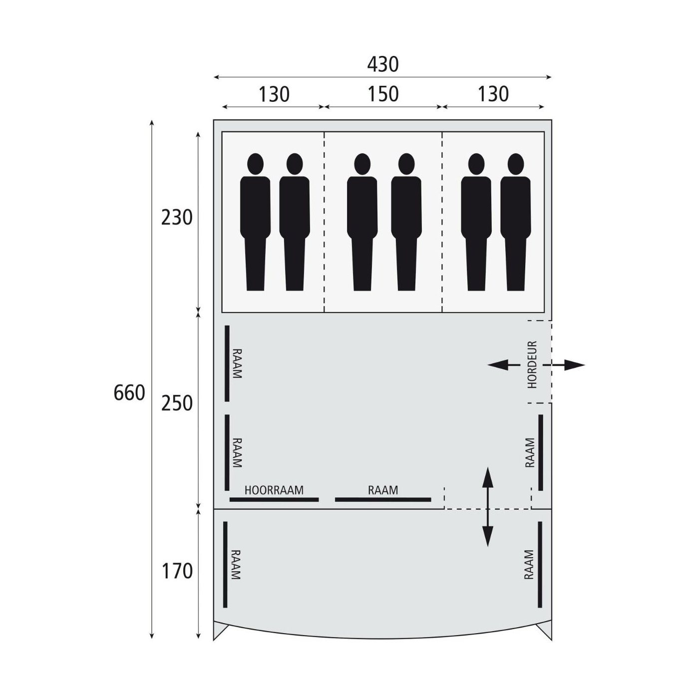 De slaapcabines zijn opgedeeld in drie aparte ruimtes. De middelste is 160 cm breed en heeft aan weerszijden scheidingswanden met ritsen. Deze kunnen makkelijk open en dicht geritst worden. De andere twee slaapcabines zijn 140 cm en 105 cm breed. Deze drie slaapcabines bevatten horrengaas in alle toegangsdeuren. De voor- en zijdeur zijn ook met een horrengaas uitgevoerd.
