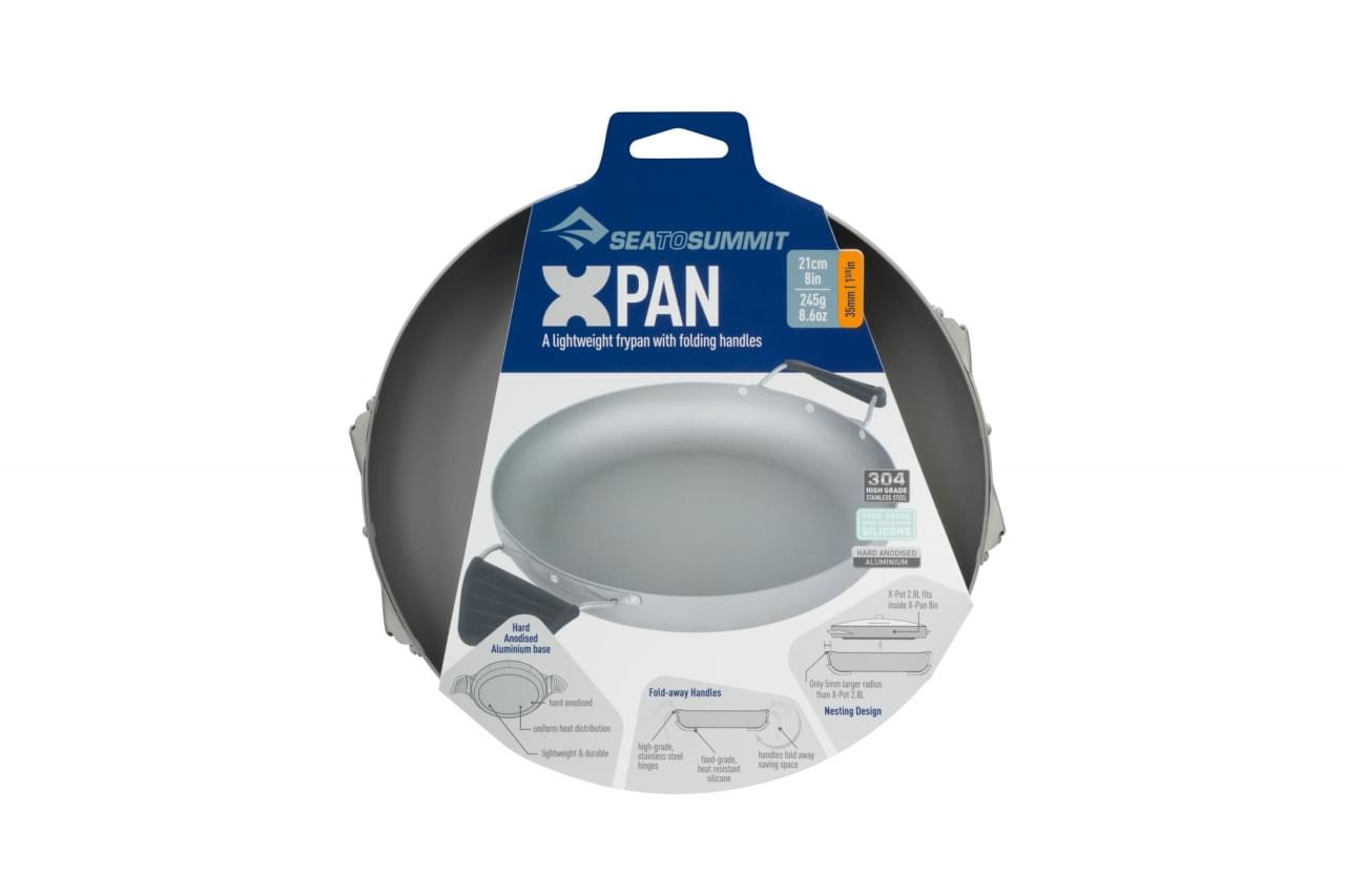 De X-Pan 8 Inch van Sea to Summit is gemaakt met de lichtgewicht kampeerder in het achterhoofd. Deze koekenpan van 20 cm is vervaardigd van hard geanodiseerd 5052 aluminium. Dit zorgt ervoor dat de pan heel licht en stijf is. Om het gewicht laag te houden is de vorm zo gemaakt met een klein handvat. Dit handvat kan achter de pan worden geklikt. De X-Pot 2.8 opvouwbare pan past perfect in de X-Pan 8 Inch door druksluiting.