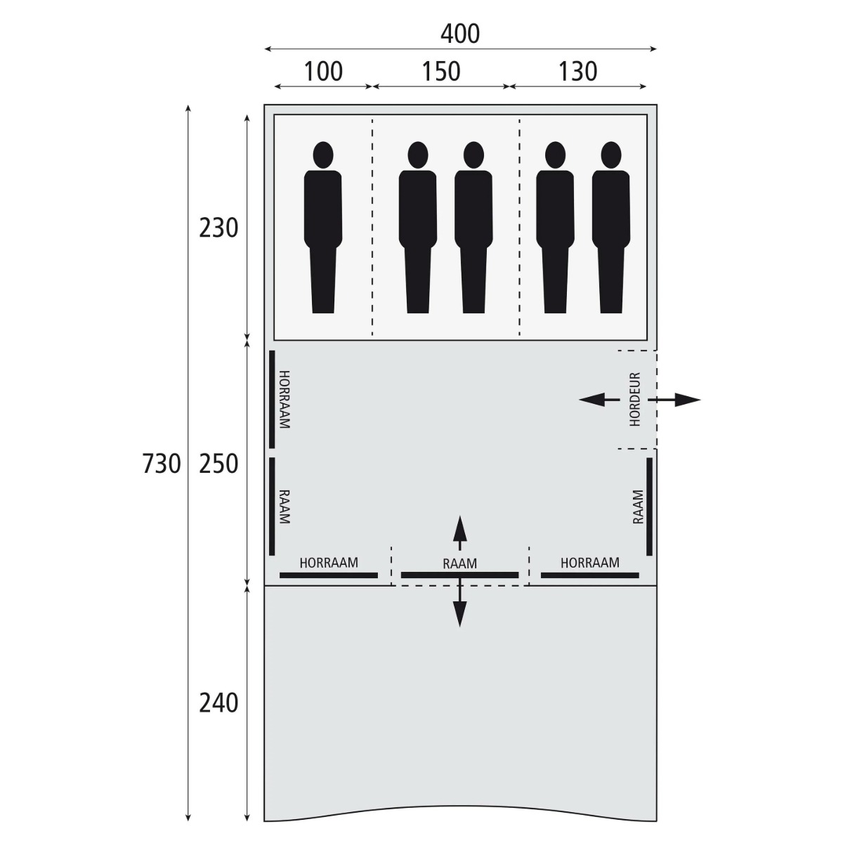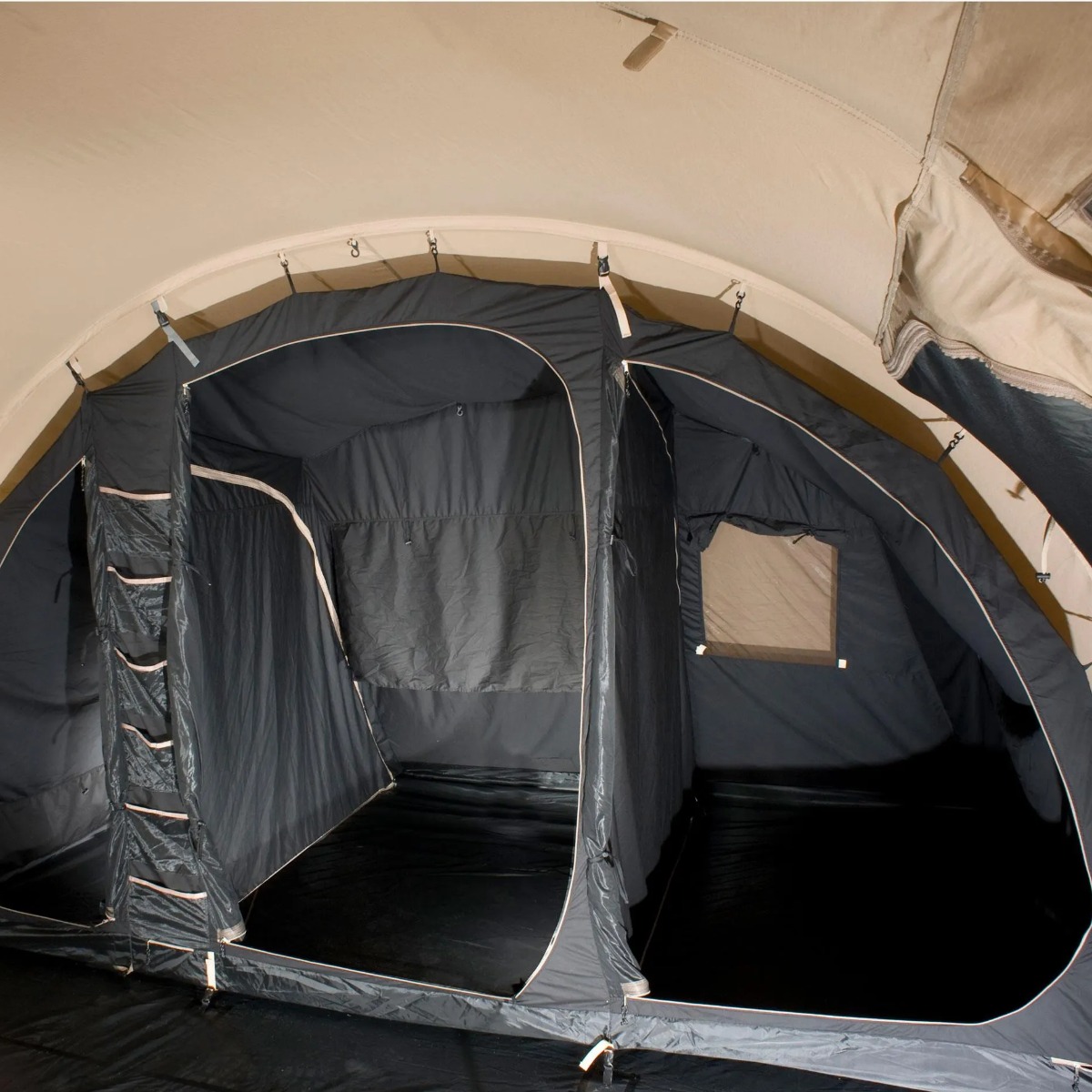 Binnenin vind je een donkere slaapcabine die zorgt voor extra slaapcomfort. De cabine is op te delen met een wegritsbare scheidingswand, zodat je de indeling flexibel kunt aanpassen. Dankzij de volledige horrengaasdeur en ventilatiemogelijkheden, zoals het Permanent Air Vent systeem en horrengaas aan de achterzijde, blijft de luchtcirculatie goed en heb je minder last van insecten.
