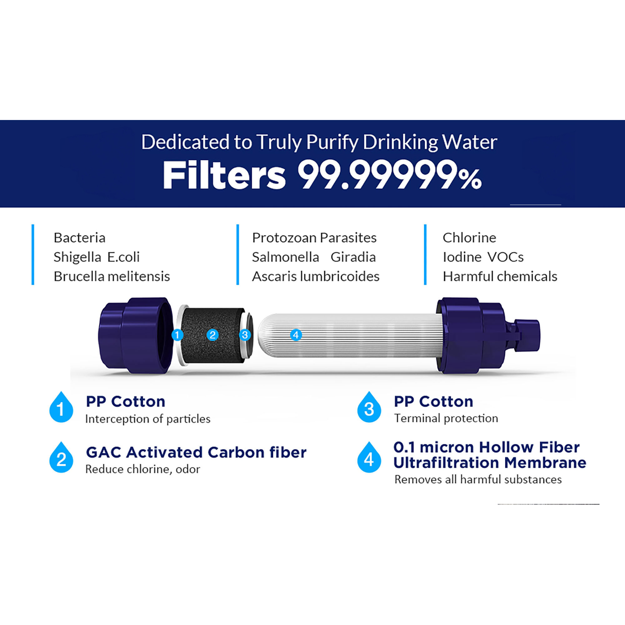 - Verwijdert tot 99,99999% bacteriën en parasieten