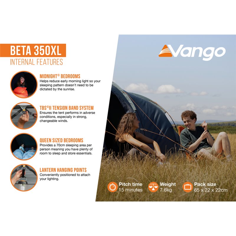 Als je op zoek bent naar ruimte en comfort dan is de Beta 350XL van Vango een echte aanrader. Het slaapgedeelte heeft een afmeting van 210 x 205 cm en biedt ruimte voor drie personen, maar is voor twee personen ook een heerlijke ruime tent. De hoogte is 1,35 meter waardoor je genoeg ruimte hebt om je makkelijk om te kleden voor bijvoorbeeld een dagje strand. Daarnaast heb je nog 4,2 m² aan leefgedeelte met een hoogte van 145 cm, hier kun je alles netjes opbergen en heerlijk een spelletje spelen op een regenachtige dag. Aan beide zijdes bevindt zich een deur in het midden van het leefgedeelte.