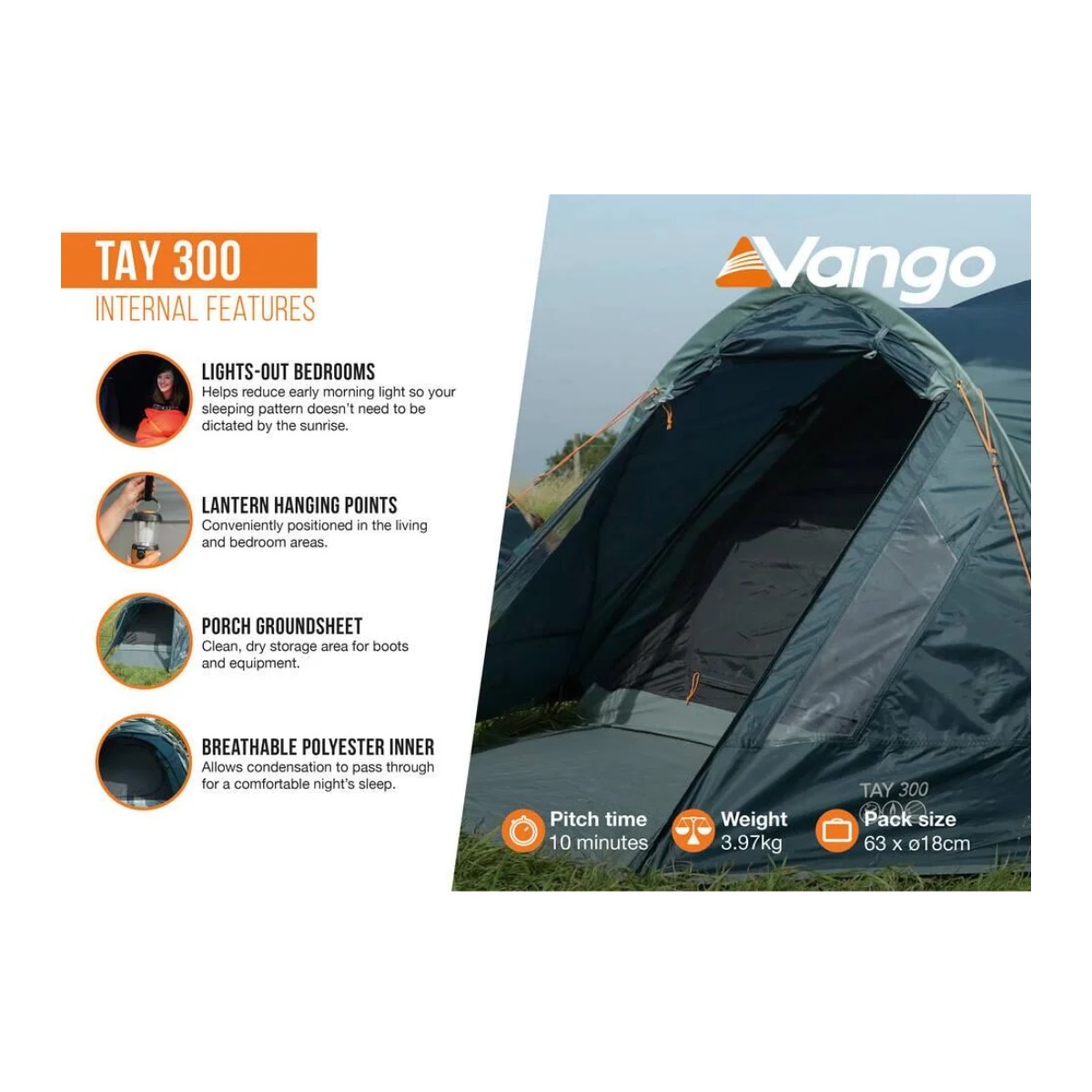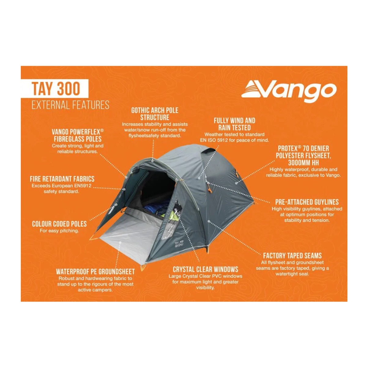 Binnenin vind je ademend polyester, handige opbergzakken en een ophangpunt voor een lampje. De tent is getest op wind en regen volgens de Europese norm en de brandvertragende stoffen overtreffen de veiligheidsnormen. De ingang van de tent kan worden opgezet als een luifel en de voorgemonteerde scheerlijnen en ruime pakzak met compressiebanden maken de Tay 300 van Vango compleet en gebruiksvriendelijk.